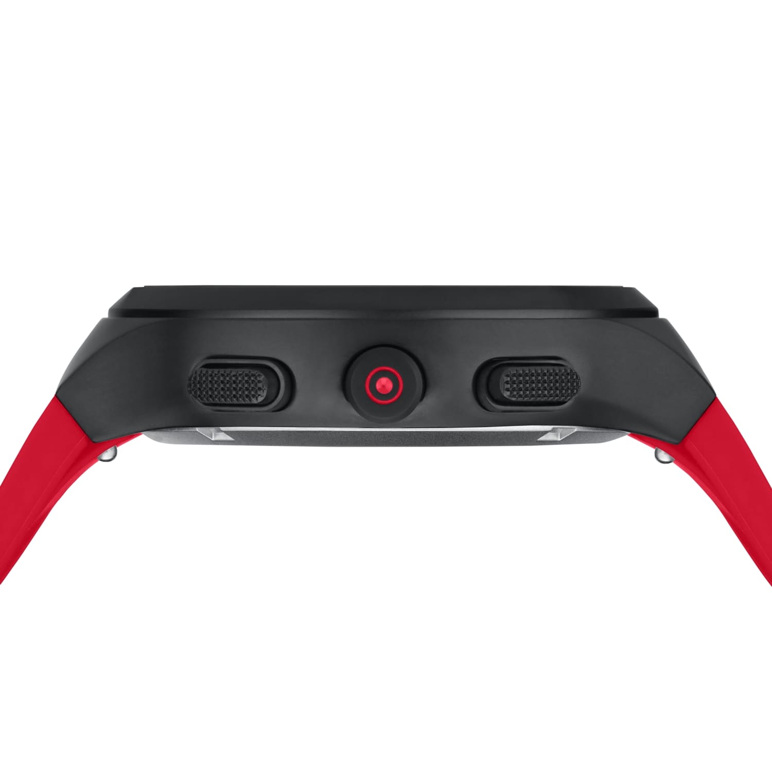 The GLOCK Chronograph Quartz Model: GW-16-1-18 features a signature 9mm bullet hole shaped 12-hour counter with red accents, center front for impact surrounded by genuine diamond markers. The black PVD coated 38mm steel case has contoured ridged lugs with black satin dial and luminous pencil shaped hands behind a scratch resistant sapphire crystal. Equipped with a sub-seconds, 30-minute, and 12-hour counter with slanted date window @4 for precision timing. The screw down crown has GLOCK cartridge primer image etched in red between black PVD coated steel chronograph pushers. Fitted with a cherry red rubber silicone strap with raised GLOCK lettering and black steel PVD coated pressed bi-fold deployant clasp to secure in place.