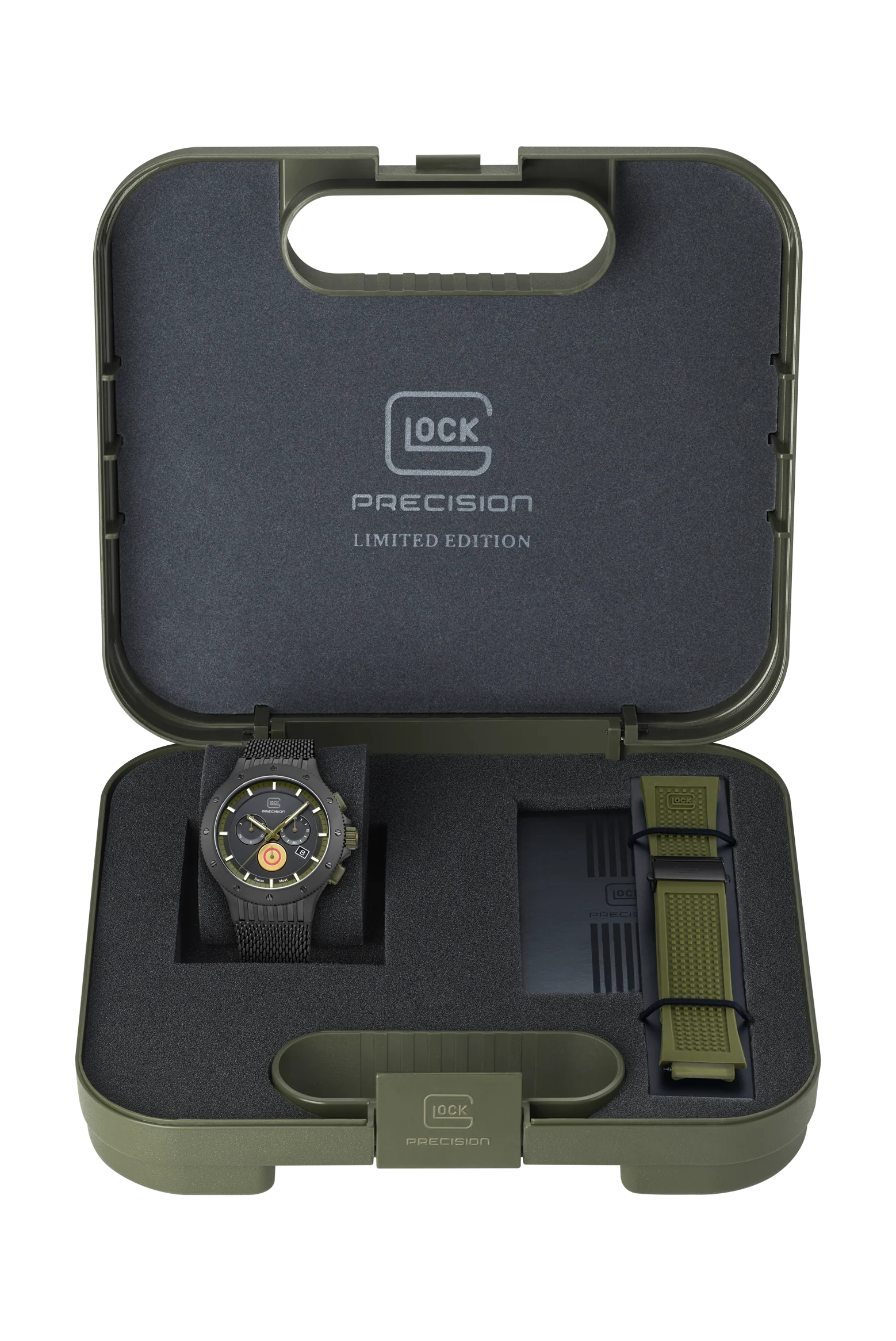 The GLOCK Chronograph Quartz Model: GW-27-1-24 is a limited edition piece with just 7500 pieces made and includes an additional quick release metal strap. The 44mm case features a signature 9mm bullet hole shaped 12-hour counter with red accents, center front for impact. The black PVD coated light-weight titanium case has contoured ridged lugs with 12 nail-head accented coin edge uni-directional bezel. A black satin dial and luminous indices with green baton shaped hands are surrounded by a green minutes track behind a scratch resistant sapphire crystal. Equipped with a sub-seconds, 30-minute, and 12-hour counter with slanted date window @4 for precision timing. The green screw down crown has GLOCK cartridge primer image etched in red between green PVD coated chronograph pushers. Fitted with an army green GLOCK RTF textured pattern rubber silicone strap with black PVD coated steel pressed bi-fold deployant clasp to secure in place. Equipped with an additional black PVD coated metal mesh strap with specialty green storage case.