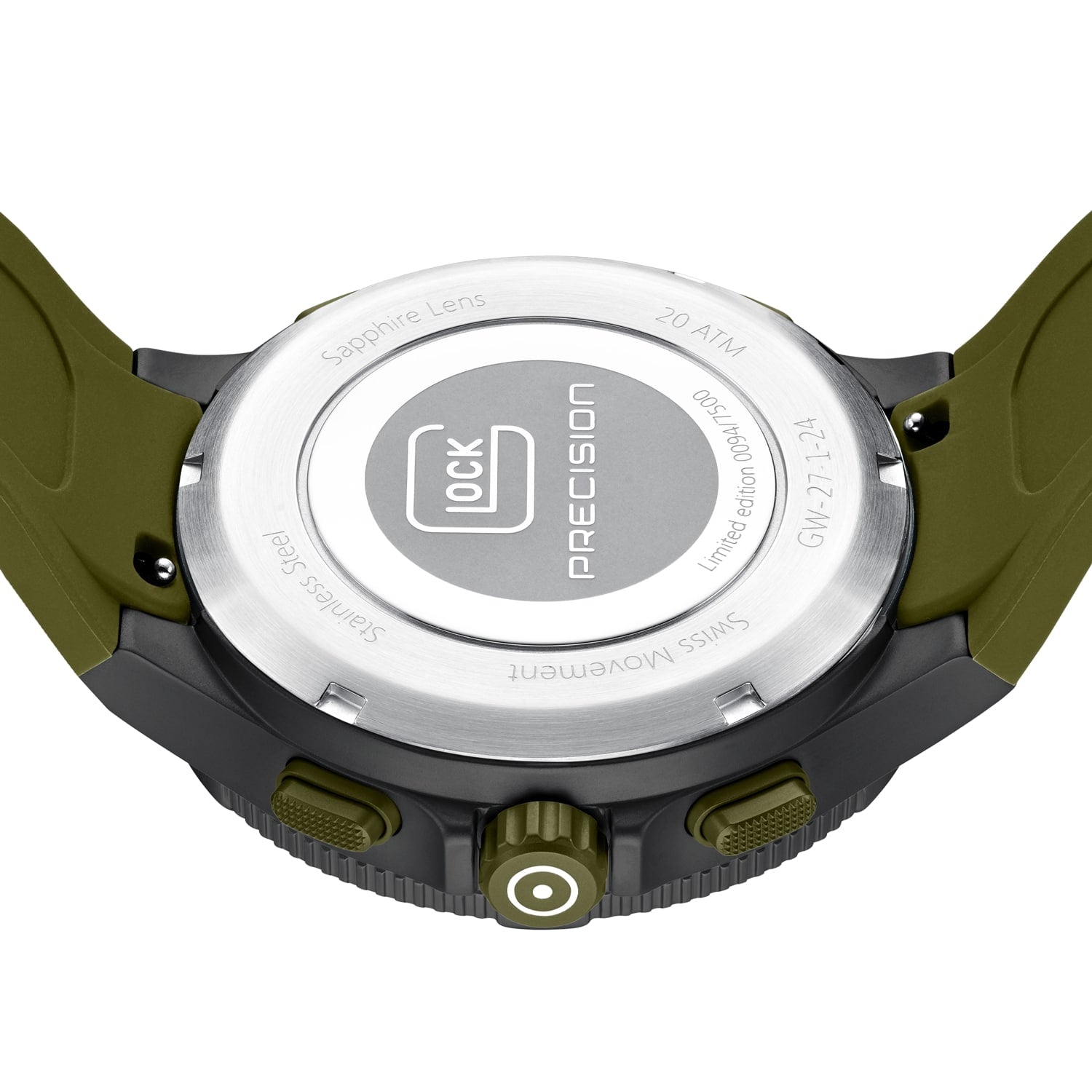 • Green PVD coated screw-down crown with etched red GLOCK cartridge primer image between black PVD coated crown guards