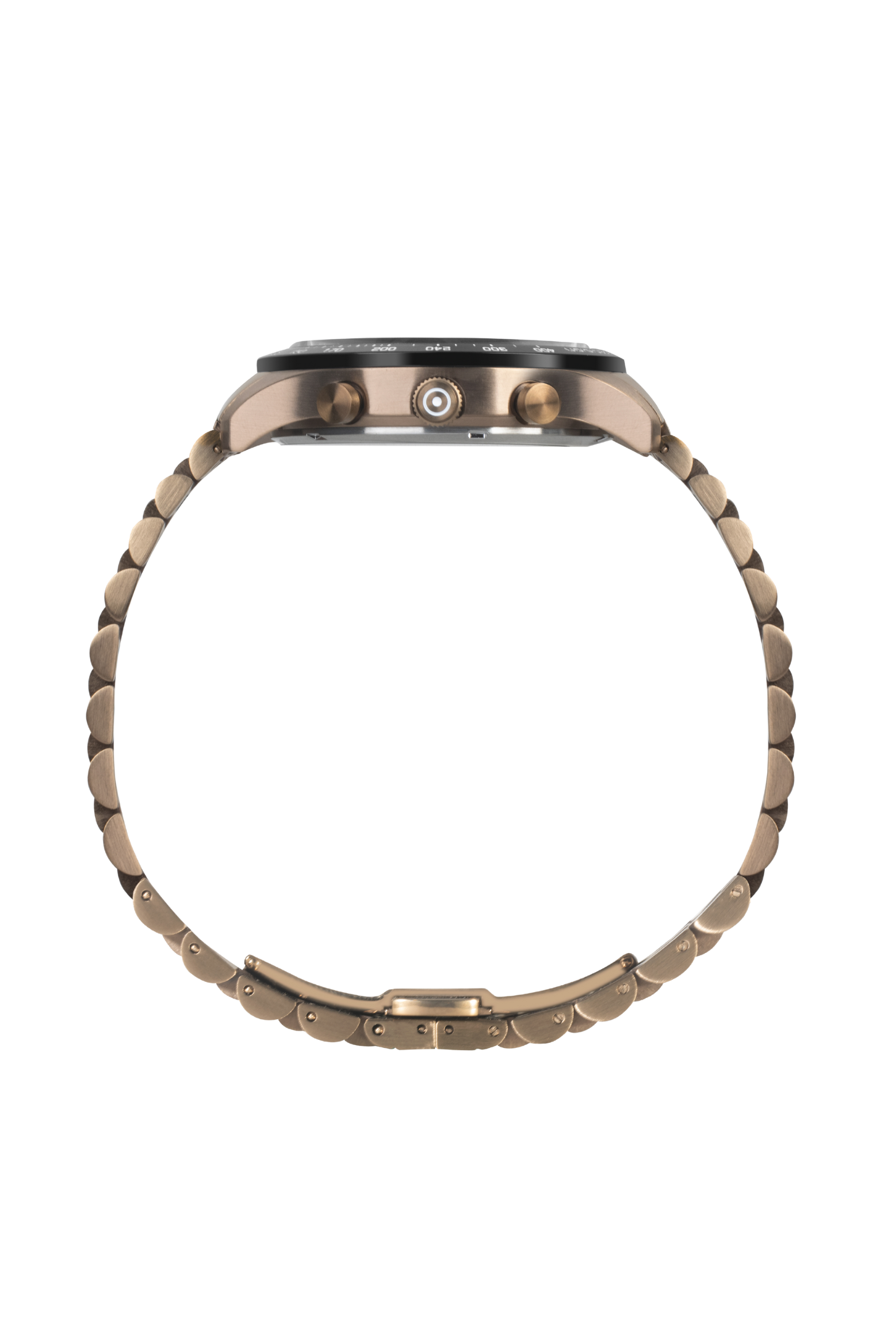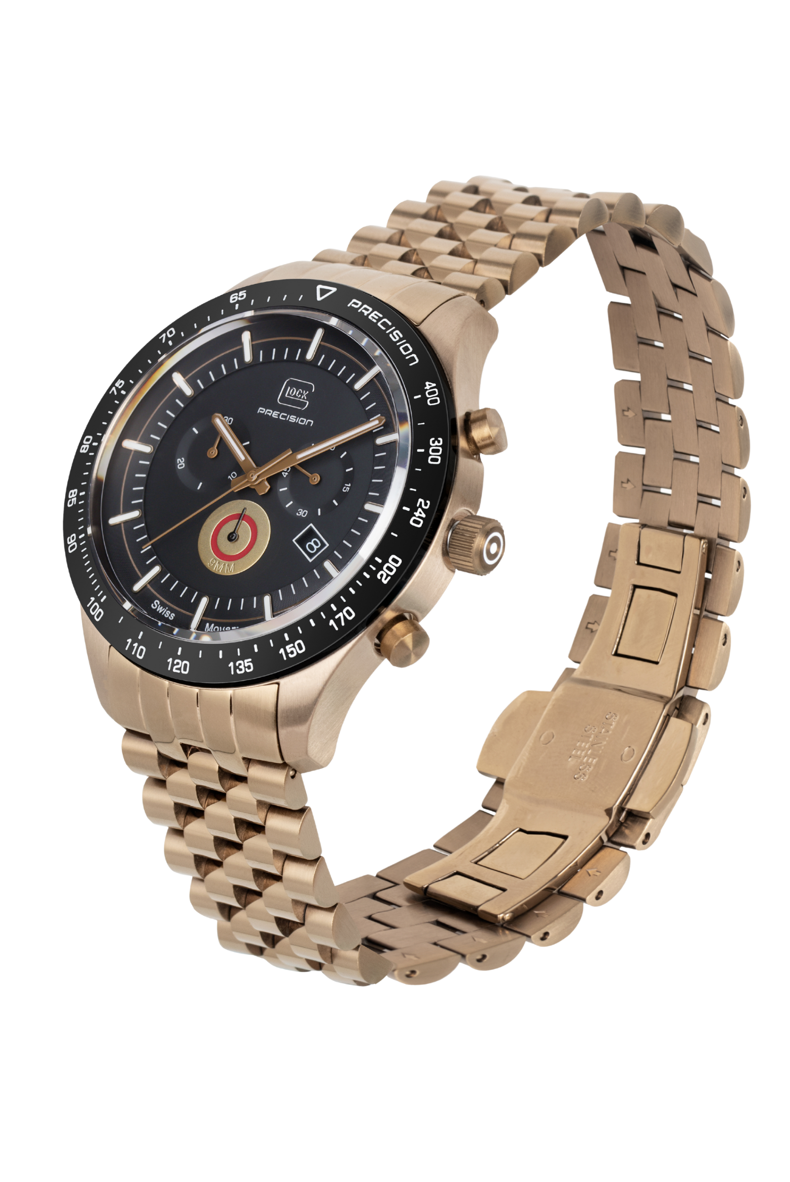 The GLOCK Chronograph Quartz Model: GW-35-2-22 features a signature 9mm bullet hole shaped 12-hour counter with red accents, center front for impact. The PVD coated coyote 46mm steel case has contoured ridged lugs with polished tachymeter bezel for speed measurement. The black satin dial has luminous brass colored indices and pencil shaped hands behind a scratch resistant sapphire crystal. Equipped with a sub-seconds, 30-minute, and 12-hour counter with slanted date window @4 for precision timing. The screw down crown has GLOCK cartridge primer image etched in white between brushed PVD coated stainless steel chronograph pushers. Fitted with a stainless steel 5-link bracelet with GLOCK logo twin push button pressed deployant clasp to secure in place.F