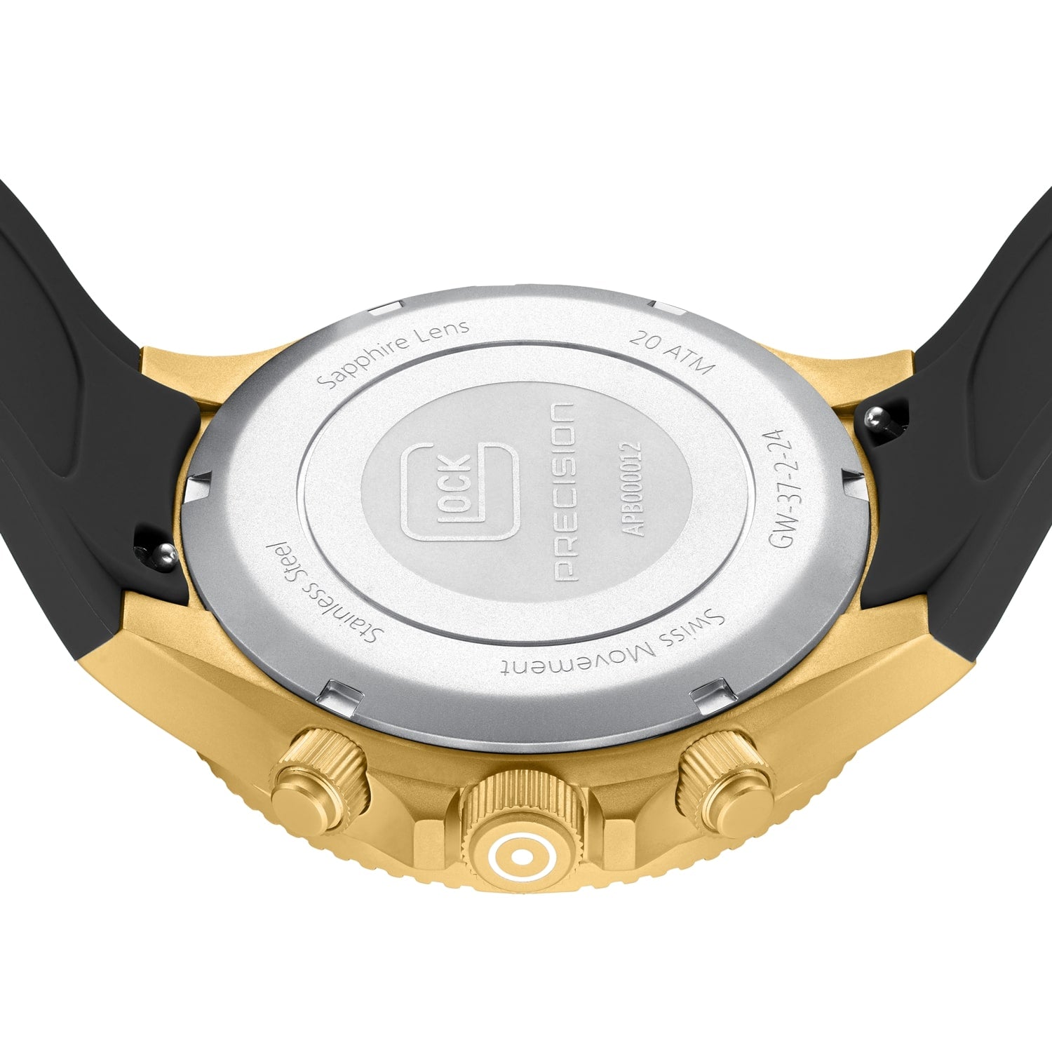 • Brushed gold-tone PVD coated steel screw-down crown with etched white GLOCK cartridge primer image positioned between crown guards