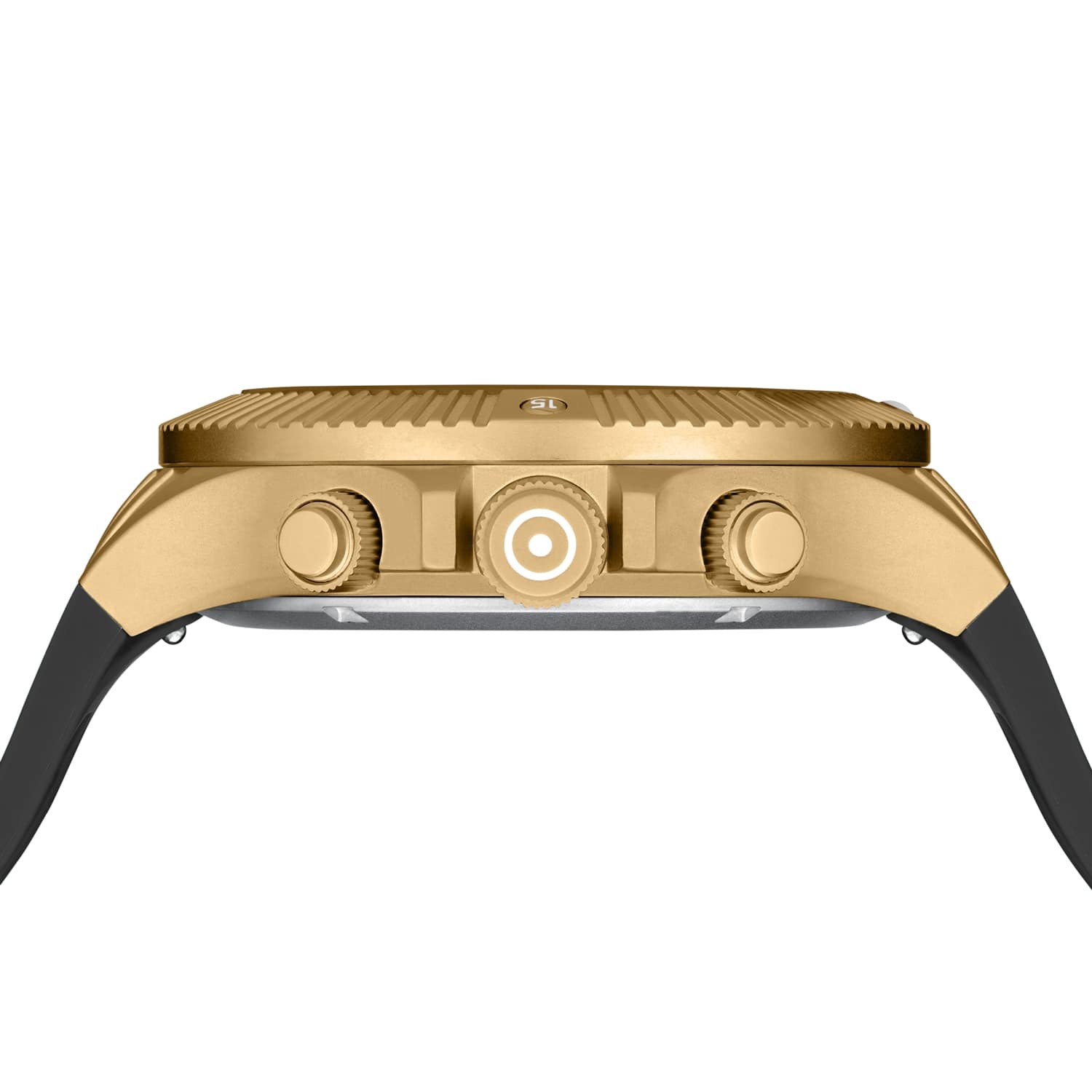 • Brushed gold-tone PVD coated ridged chronograph pushers