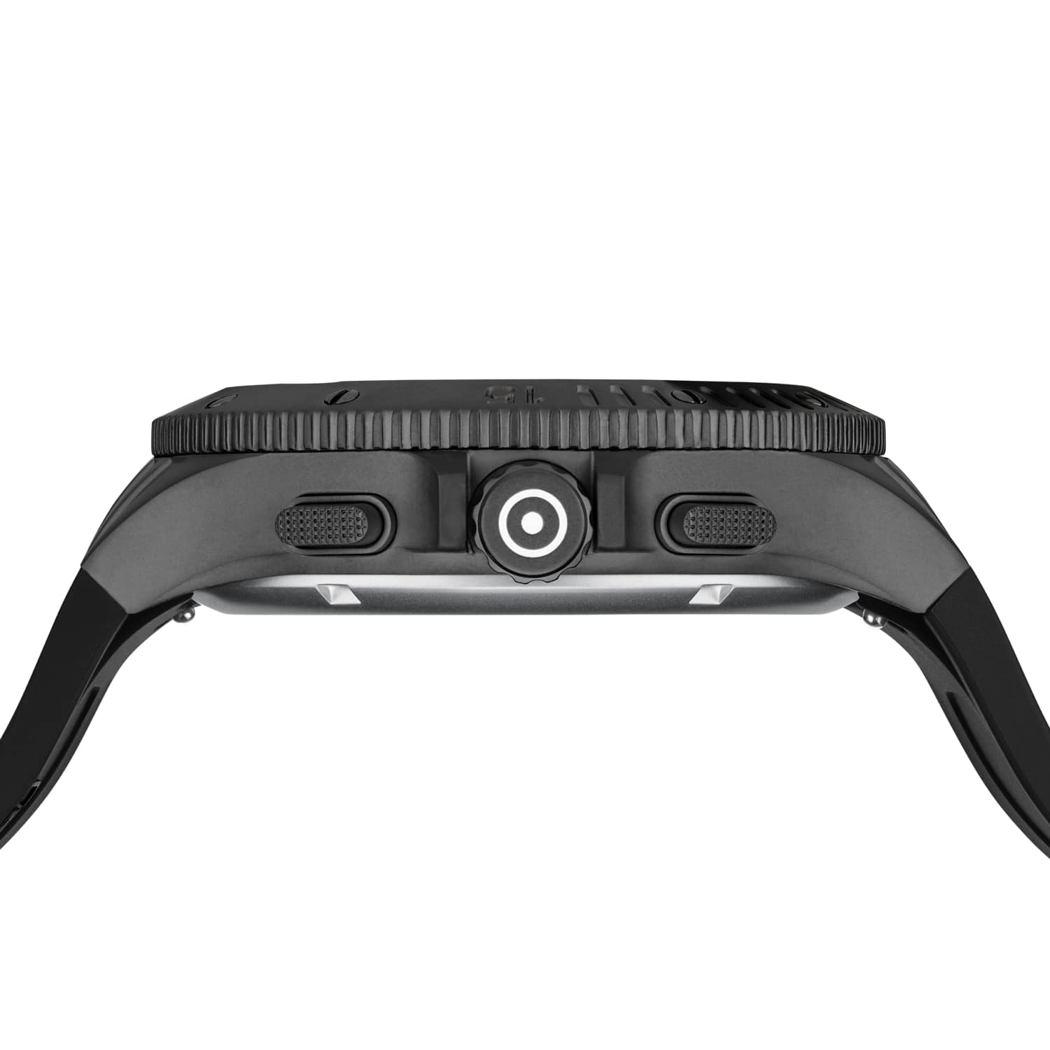 • Black PVD coated oblong chronograph pushers with cross-grain textured tops