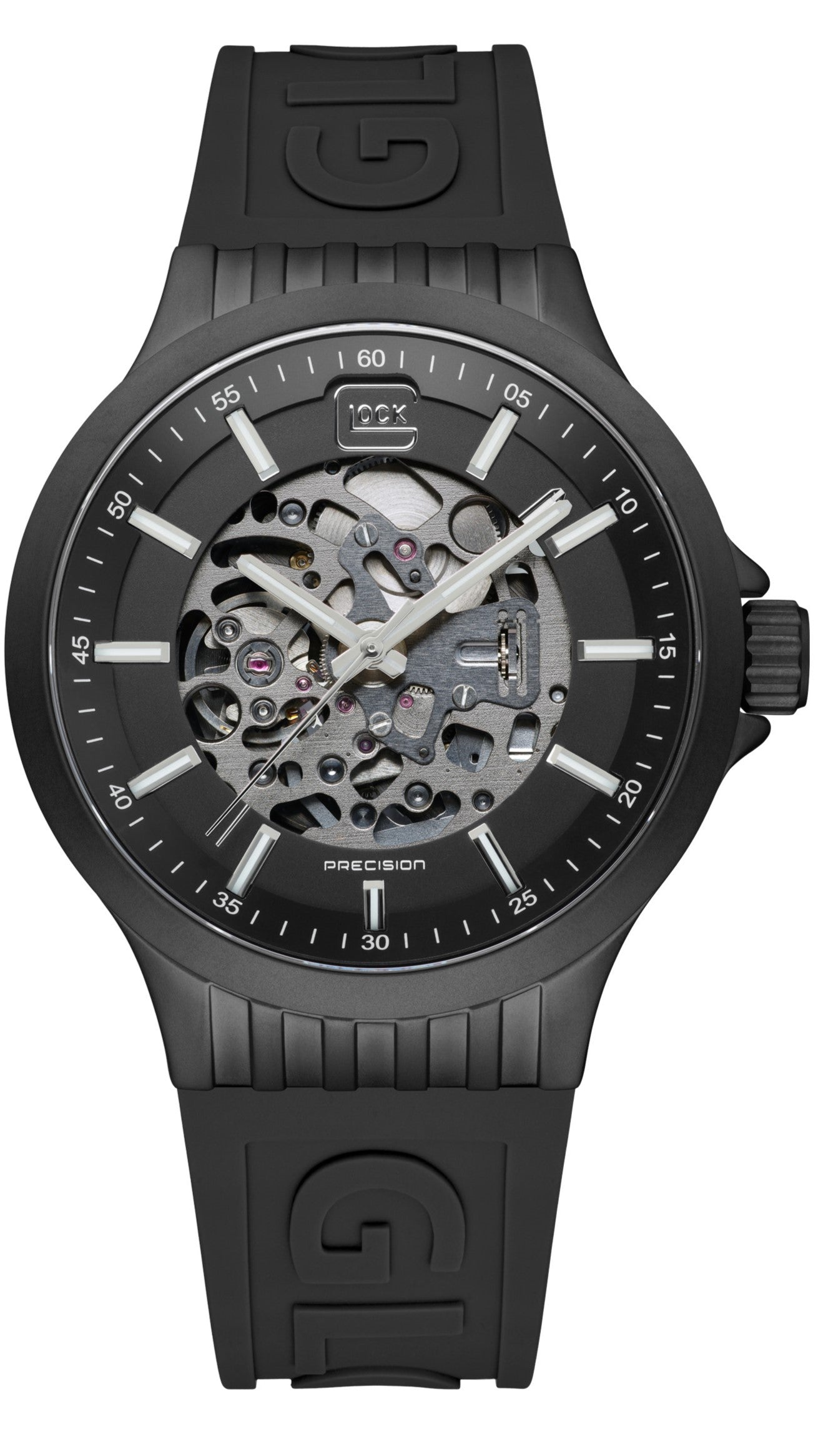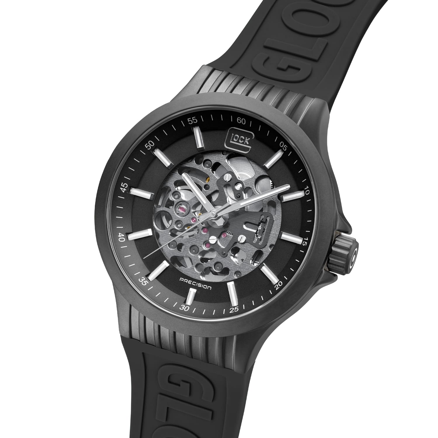 The GLOCK Skeleton Open-heart Automatic Model: GW-14-1-24 features a dial that displays the Swiss movement inner workings of the watch on both the dial front and the exhibition case-back.  The brushed black PVD coated 44mm steel case has contoured ridged lugs and circular open-heart cut-out within the black satin dial. Silver Super-Luminova® baton shaped hands and applied indices are surrounded by a beveled minutes track viewable behind a scratch resistant sapphire crystal. The screw down black PVD coated crown has GLOCK cartridge primer image etched in white between a protective crown guard to combat dirt intrusion.  Fitted with a black rubber silicone strap with raised GLOCK lettering and black steel PVD coated pressed bi-fold deployant clasp to secure in place.