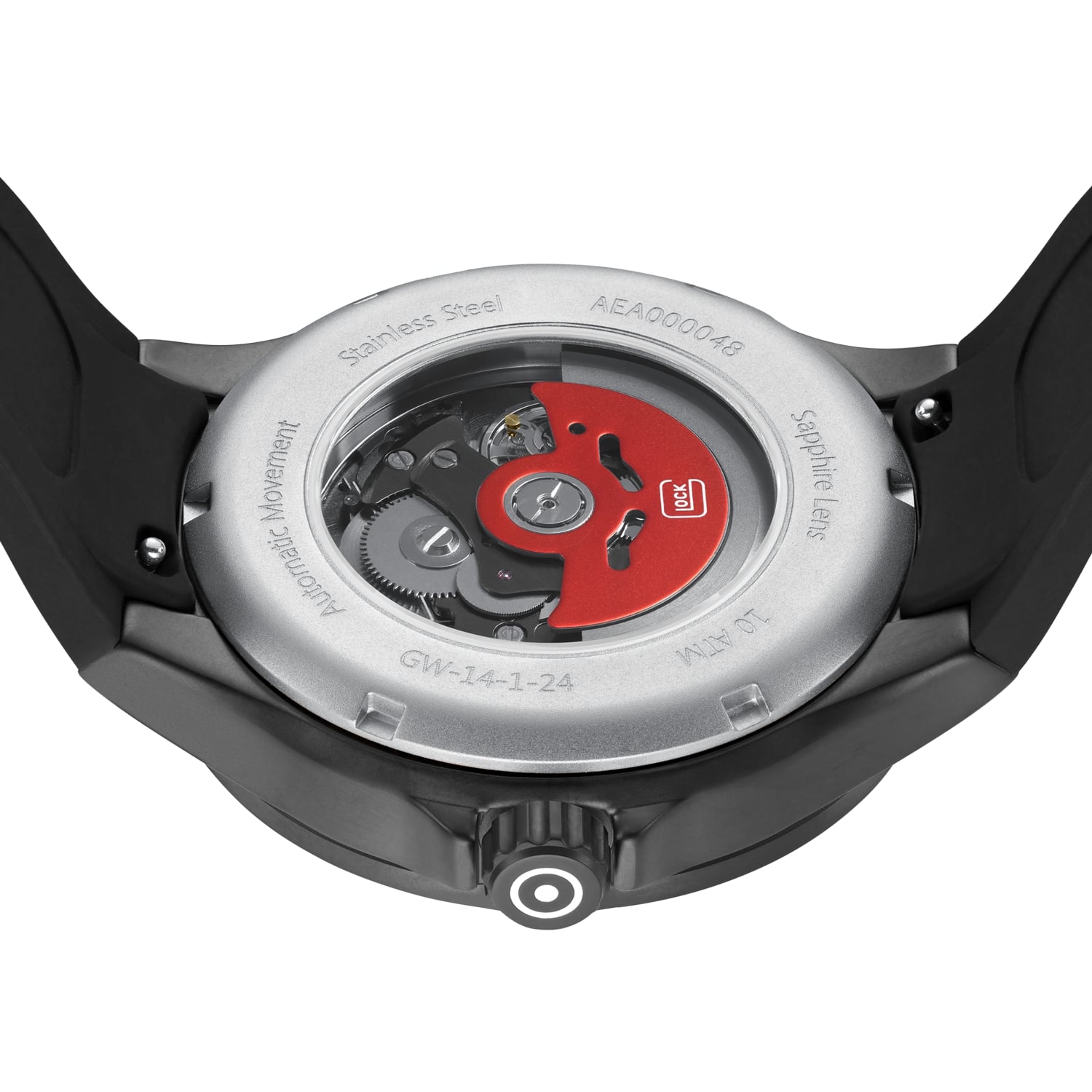 • PVD coated steel polished screw-down crown with etched white GLOCK cartridge primer image between crown guard