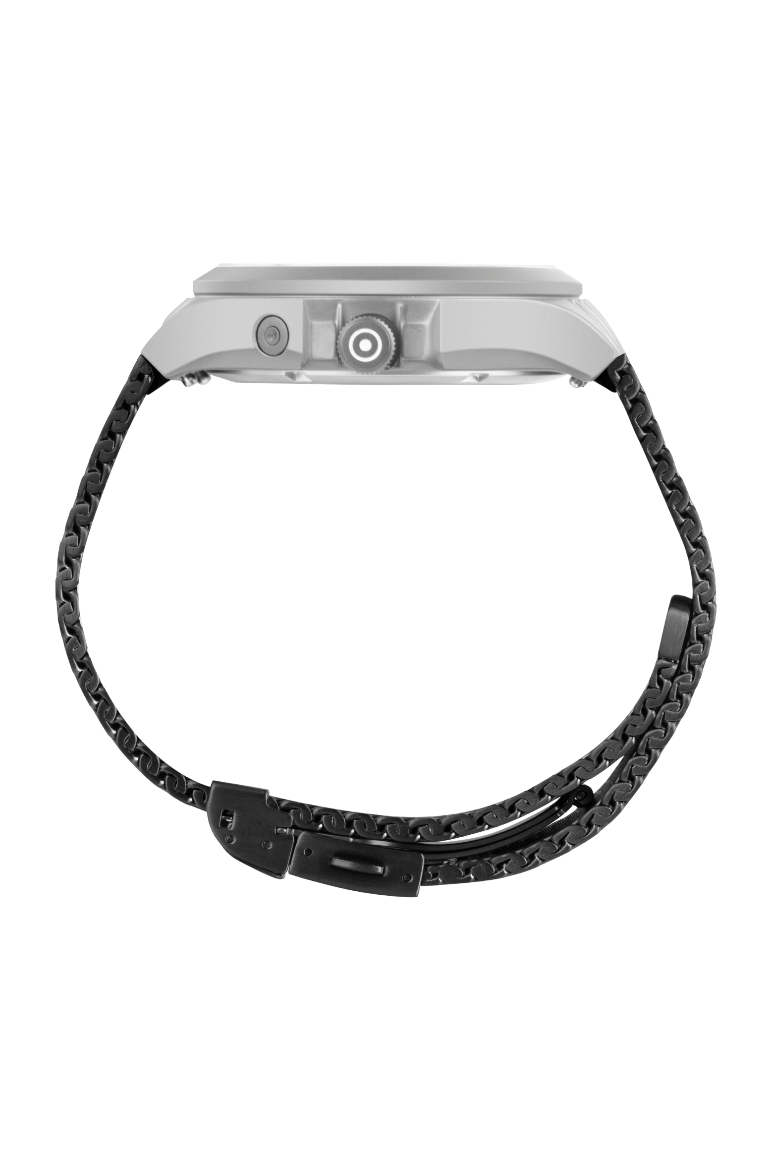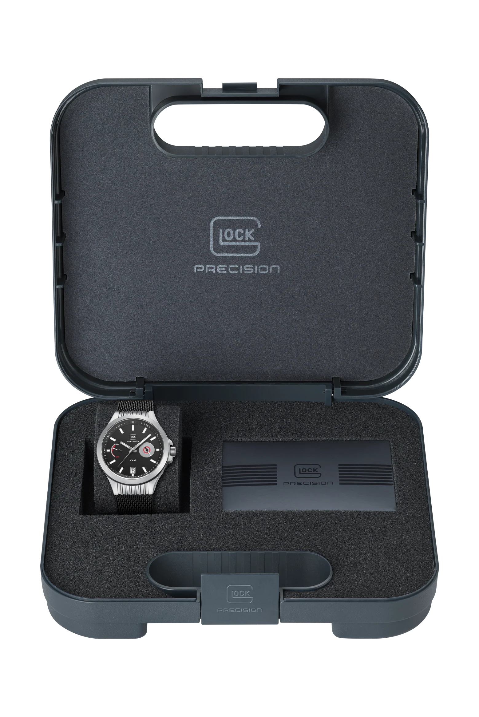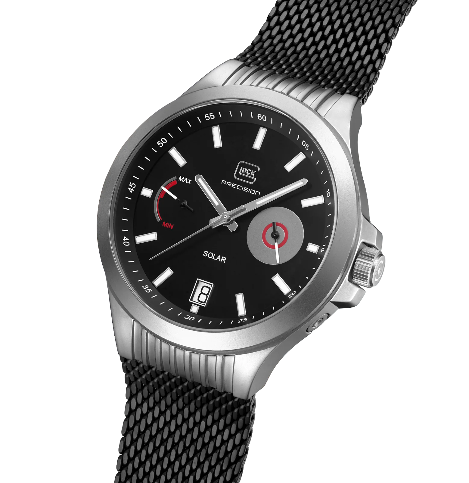 The GLOCK Solar powered wrist watch, Model: GW-19-2-22 features a power reserve indicator and signature silver 9mm bullet casing shaped sub-seconds counter with red, white and black accents. Date window @6 with luminous indices and pencil shaped hands are viewable behind a scratch resistant sapphire crystal. The sandblasted steel 42mm case has contoured ridged lugs. Equipped with a 100 meter water resistant crown with GLOCK cartridge primer image etched in white between protective crown guards. Fitted with black mesh strap with PVD coated steel pressed bi-fold deployant clasp to secure in place.