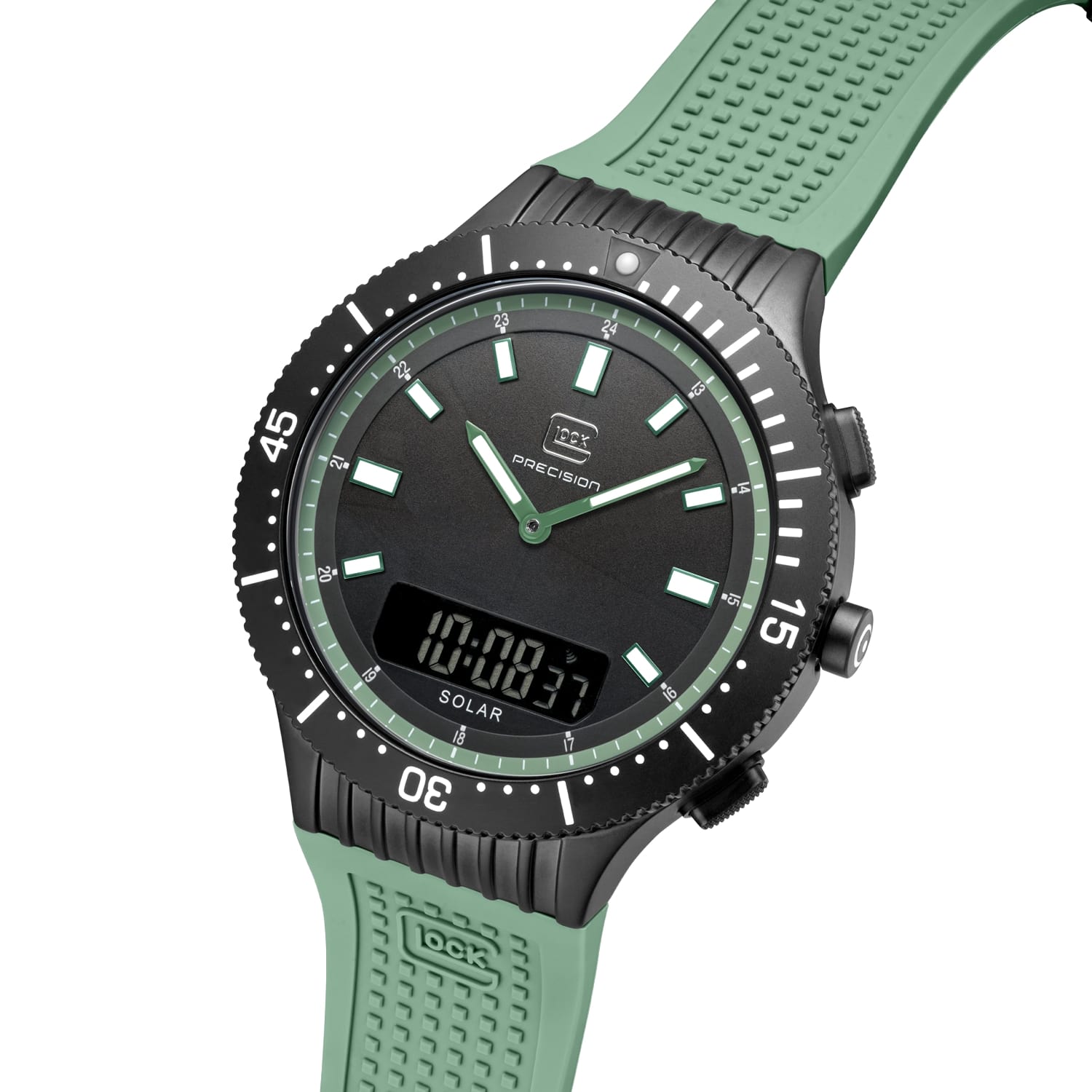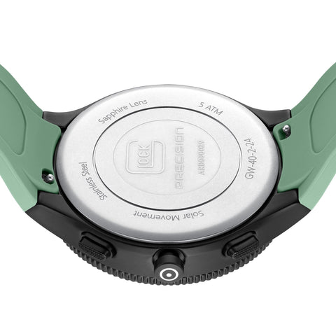 The GLOCK solar powered timepiece, Model: GW-40-24 is two watches in one with both an analog and digital feature. The 46mm black PVD coated brushed steel case has contoured ridged lugs under a scratch resistant sapphire crystal. The black satin dial is surrounded by a black PVD coated coin edge uni-directional bezel with white markers. Bi-colored black and green 24-hour track on separate outside dial disc encompasses luminous green pencil shaped hands and applied stick indices for precision timing. LCD digital display window has 24hour time, day/date, alarm, and stopwatch function for convenience.  A black PVD coated crown has GLOCK cartridge primer image etched in white between the digital chronograph pushers with 50 meter water resistance rating. Fitted with a green GLOCK RTF textured pattern rubber silicone strap with black PVD coated steel pressed bi-fold deployant clasp to secure in place.