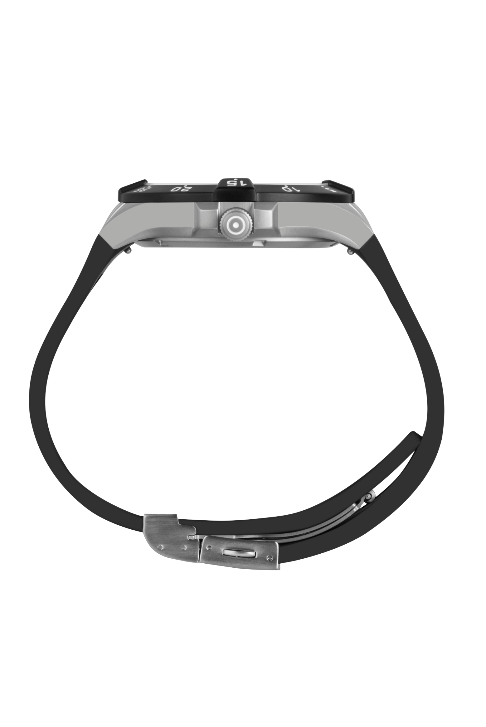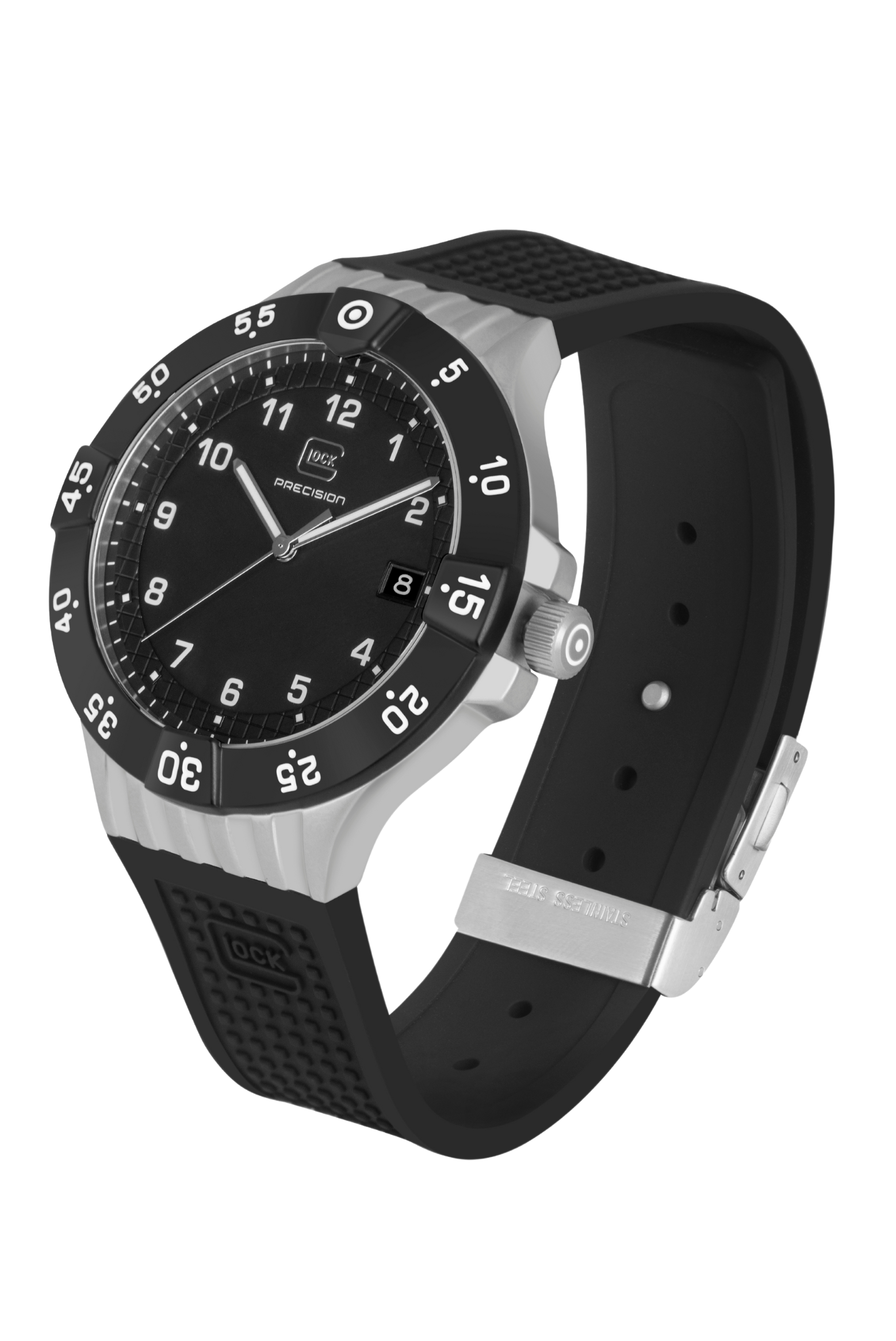 The GLOCK Quartz Model: GW-15-6-22 timepiece has a sandblasted steel case with unidirectional coin-edged black bezel and white 60 minute markers. The 43mm case with contoured ridged lugs has a black 3D grid textured dial with satin center dial disc under a a scratch resistant sapphire crystal. Luminous pencil shaped hands are surrounded by a 60-minutes track for precision timing. Equipped with a date window @3 and luminous Arabic and stick markers on inside chapter ring. An easy grip push-pull crown has GLOCK cartridge primer image etched in white between protective crown guards. Fitted with a black GLOCK RTF textured pattern rubber silicone strap with steel pressed bi-fold deployant clasp to secure in place.