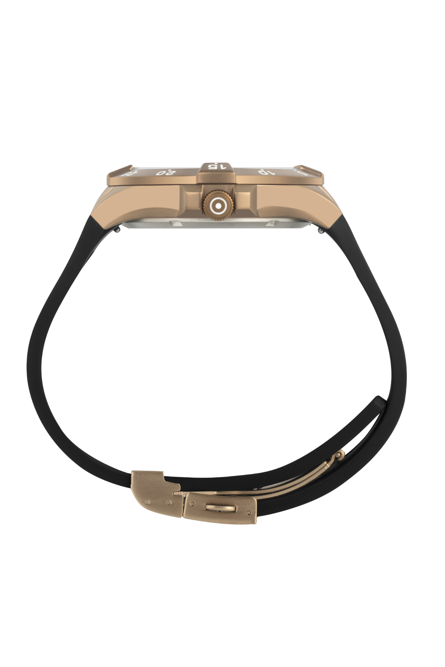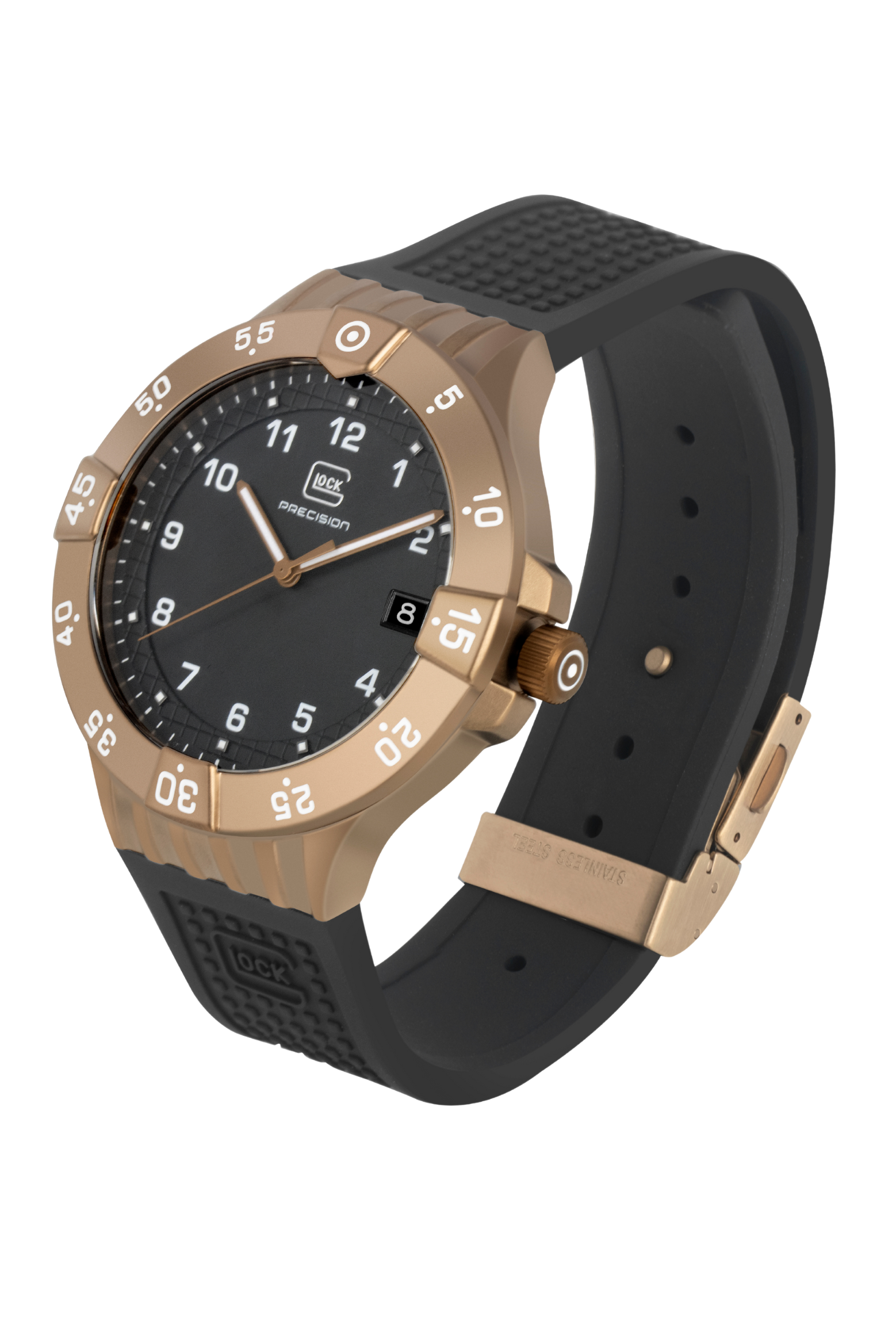 The GLOCK Quartz Model: GW-15-7-22 timepiece has a sandblasted PVD coated coyote steel case with unidirectional coin-edged bezel and white 60 minute markers. The 43mm case with contoured ridged lugs has a black 3D grid textured dial with sunbrushed center dial disc under a scratch resistant sapphire crystal. Luminous pencil shaped hands are surrounded by a 60-minutes track for precision timing. Equipped with a date window @3 and luminous Arabic markers on inside chapter ring.  An easy grip push-pull crown has GLOCK cartridge primer image etched in white between protective crown guards. Fitted with a black GLOCK RTF textured pattern rubber silicone strap with PVD coated coyote steel pressed bi-fold deployant clasp to secure in place.