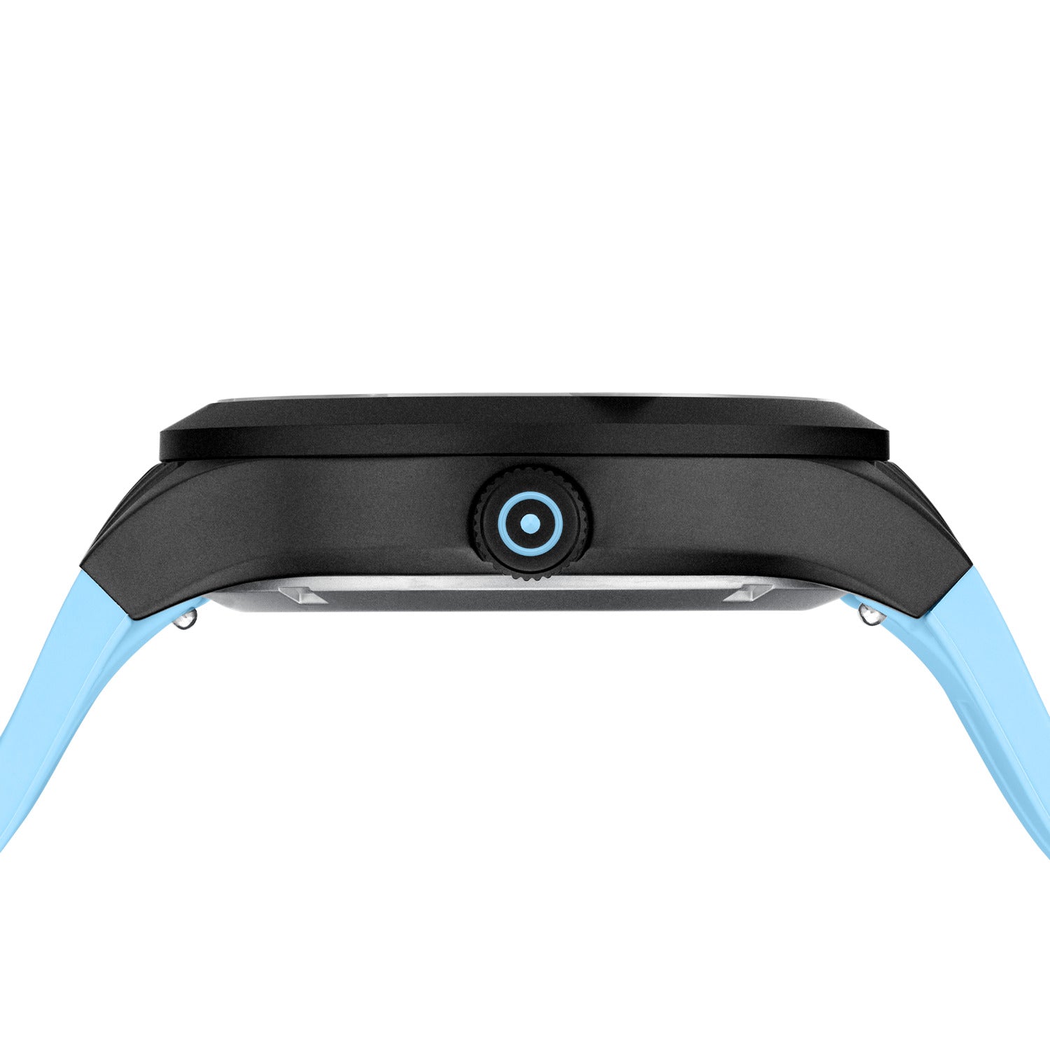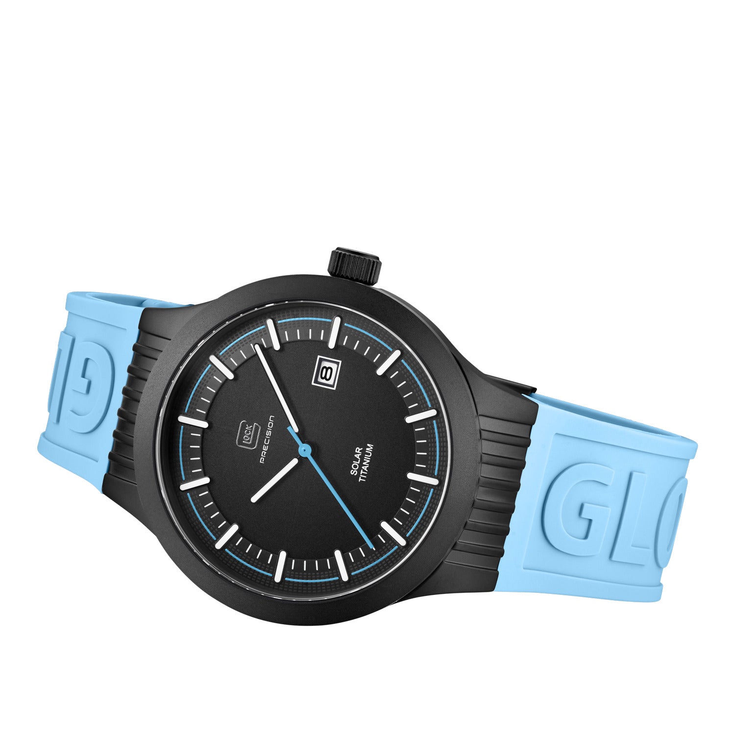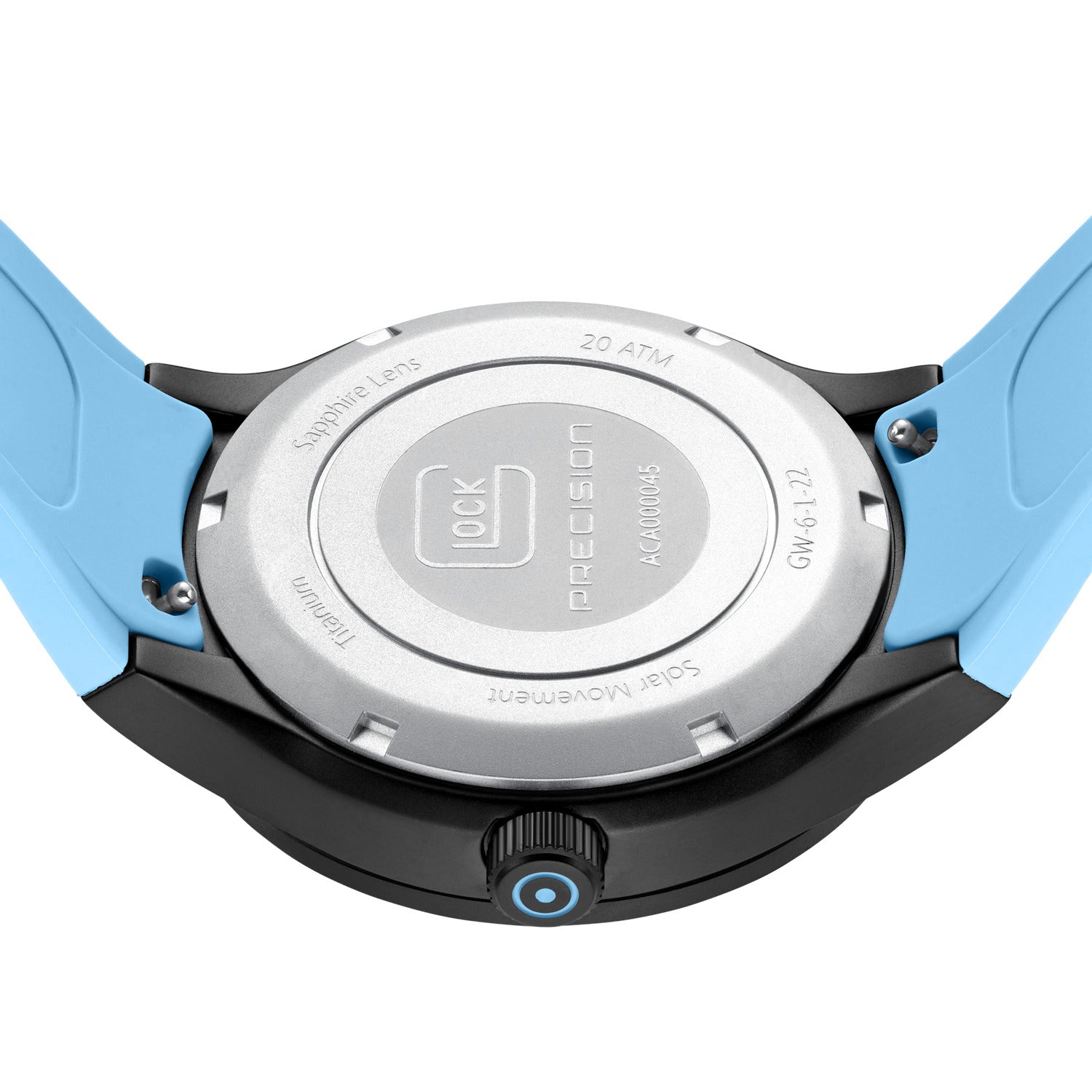 The GLOCK solar powered timepiece, Model: GW-6-1-22 features a light-weight 40mm black PVD coated brushed titanium case with contoured ridged lugs. The black satin dial has luminous baton shaped hands with date window @3 behind a scratch resistant sapphire crystal. Equipped with a luminous stick indices and blue accented minutes track on separate outside dial disc for precision timing. The screw down crown has GLOCK cartridge primer image etched in blue with 200 meter water resistance rating. Fitted with a turquoise blue rubber silicone strap with raised GLOCK lettering and black steel PVD coated pressed bi-fold deployant clasp to secure in place.