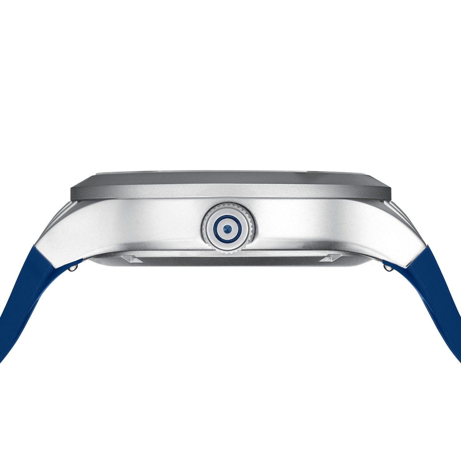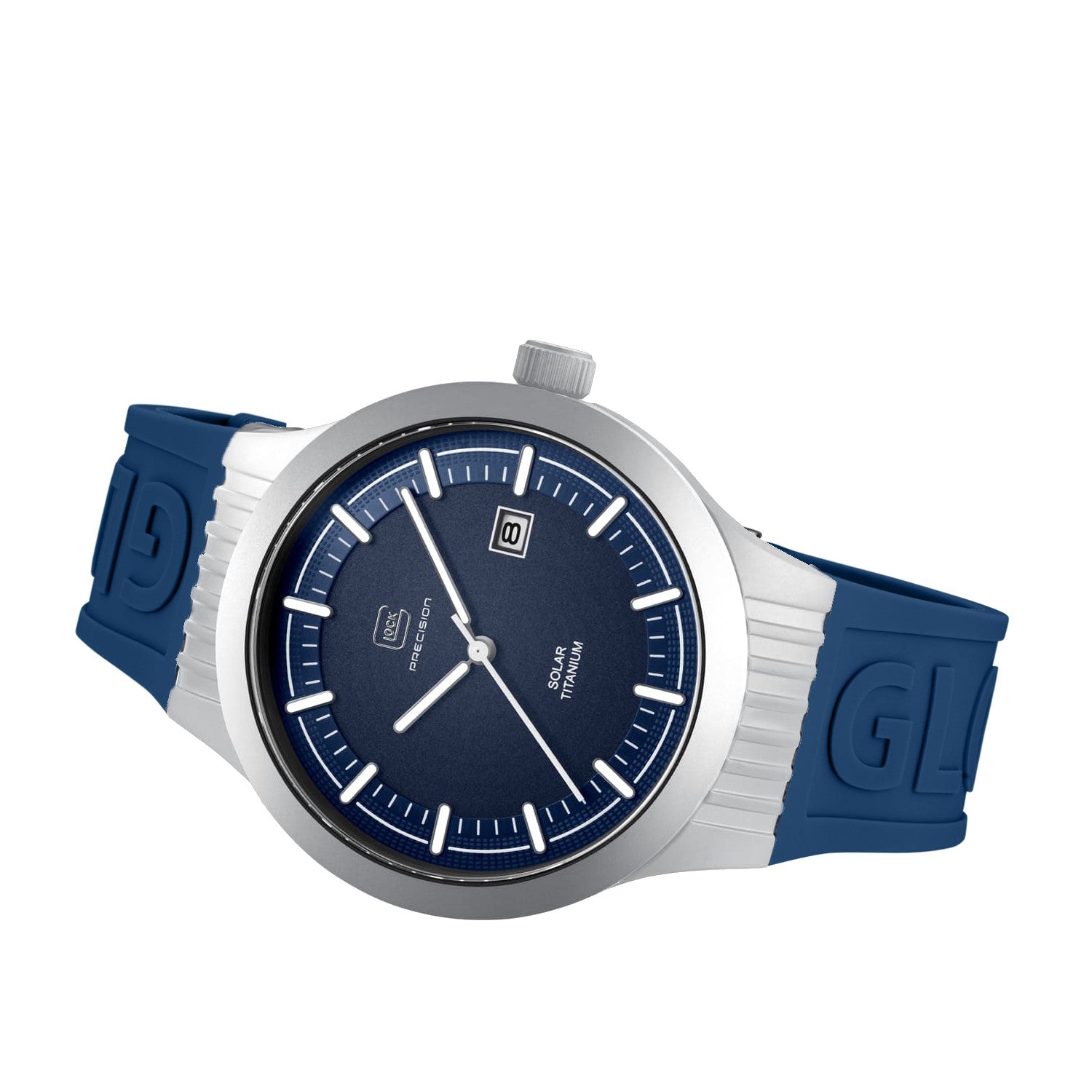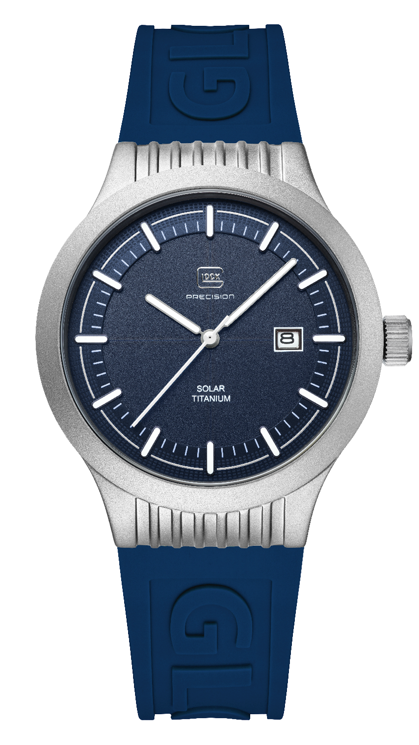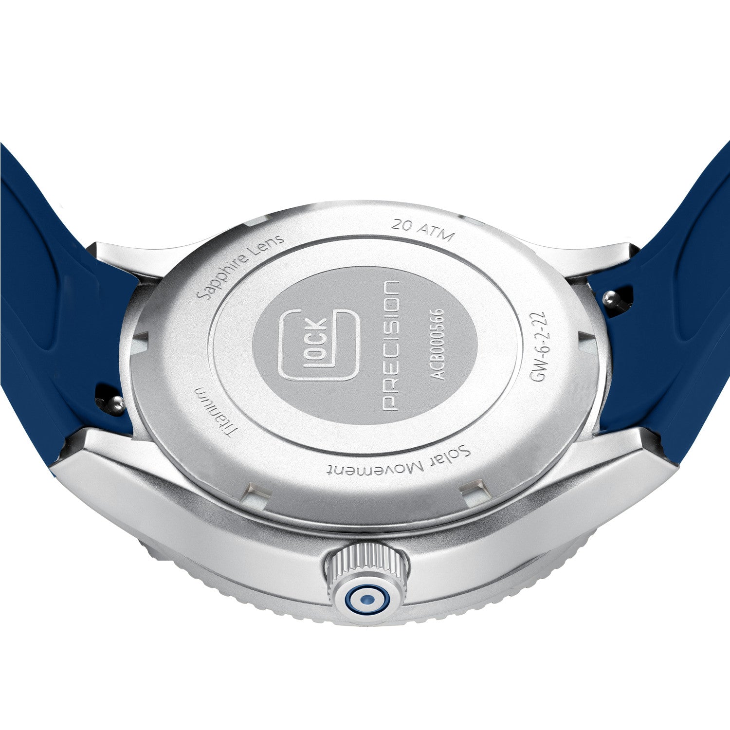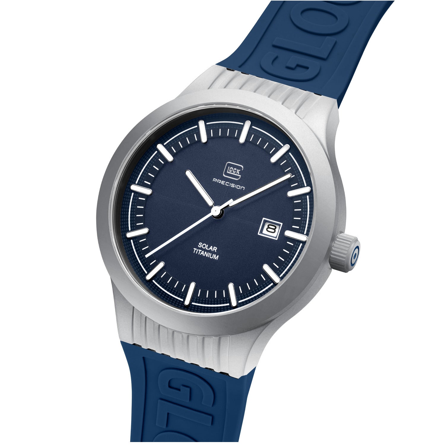 The GLOCK solar powered timepiece, Model: GW-6-2-22 features a light-weight 40mm brushed titanium case with contoured ridged lugs. The navy blue satin dial has luminous baton shaped hands with date window @3 behind a scratch resistant sapphire crystal. Equipped with a luminous stick indices and white minutes track on separate outside dial disc for precision timing. The screw down crown has GLOCK cartridge primer image etched in blue with 200 meter water resistance rating. Fitted with a navy blue rubber silicone strap with raised GLOCK lettering and brushed steel pressed bi-fold deployant clasp to secure in place.