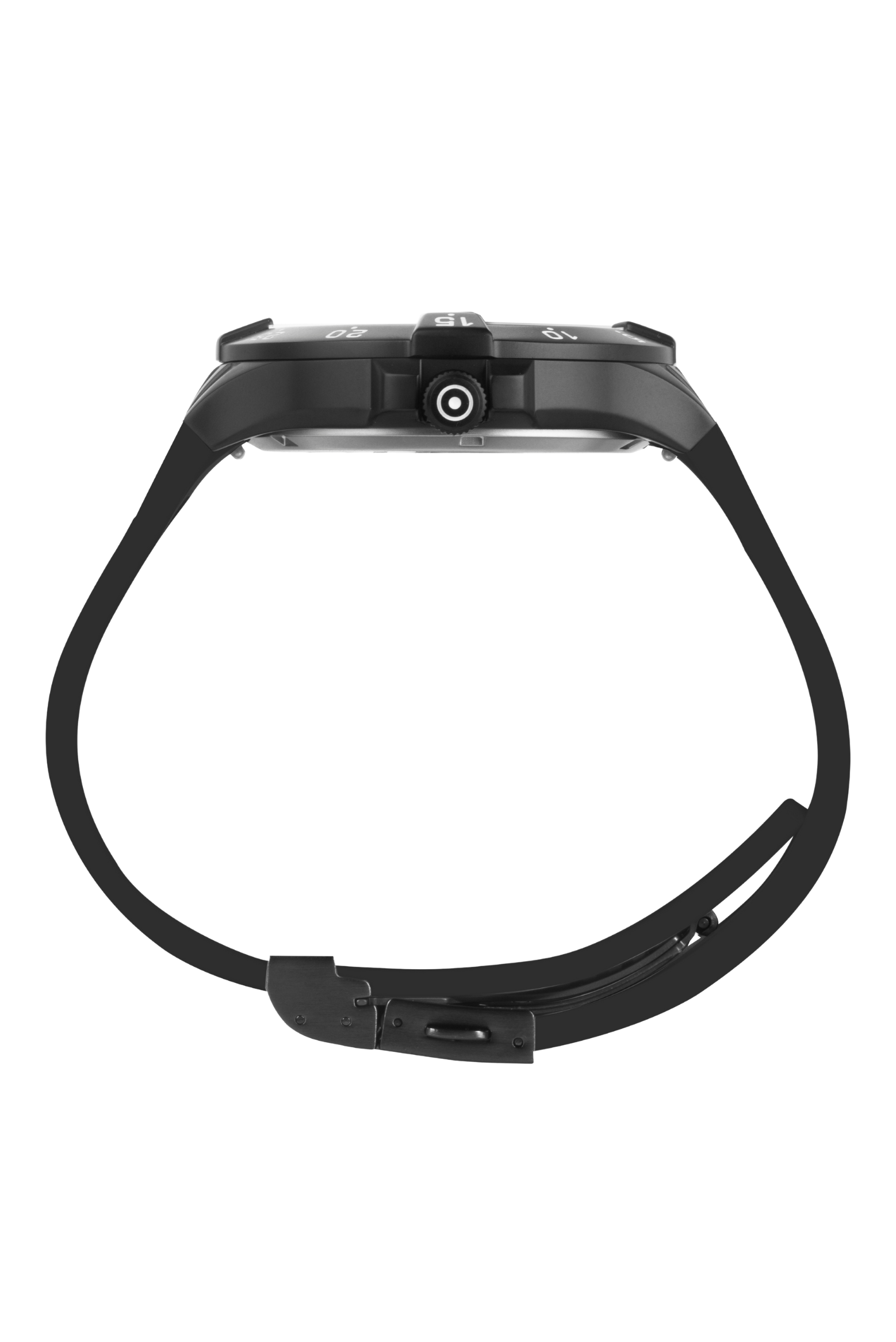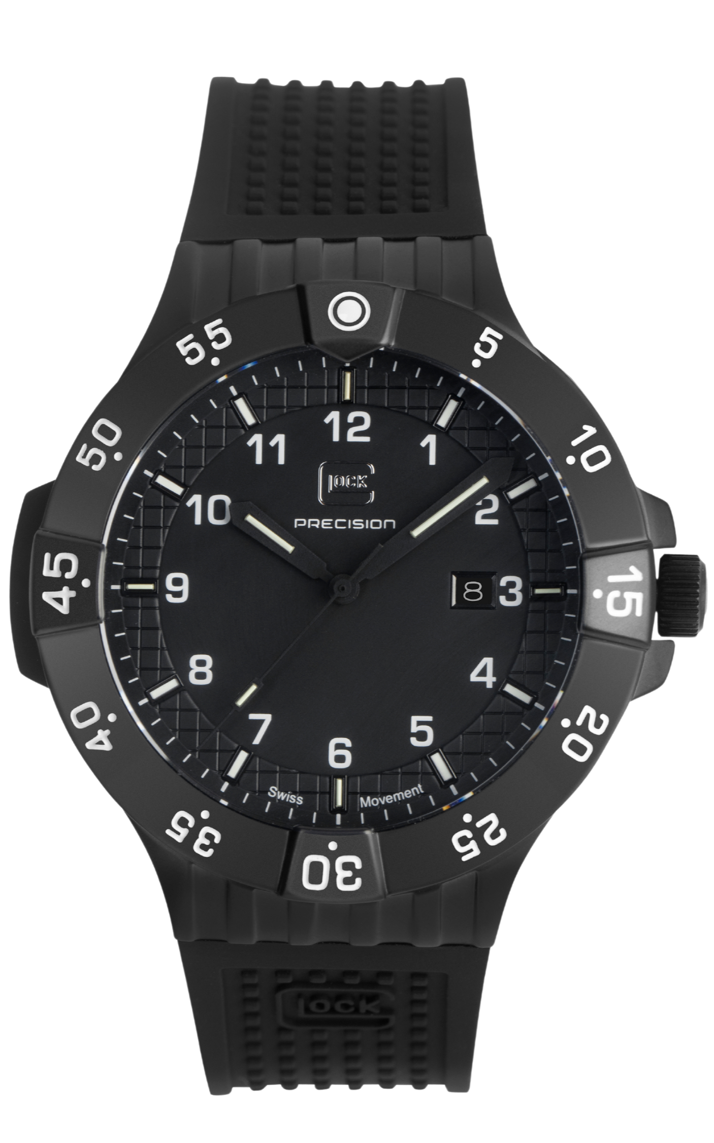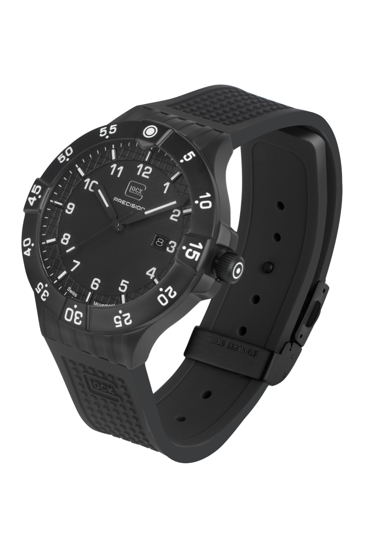 The GLOCK Quartz Model: GW-15-3-22 timepiece features Tritium lit markers ensuring constant illumination for enhanced visibility in low-light conditions. The black PVD coated case has a unidirectional coin-edged  bezel with white 60 minute markers. The 43mm sandblasted steel case with contoured ridged lugs has a black 3D grid textured dial with smooth center dial disc under a a scratch resistant sapphire crystal. Black luminous pencil shaped hands are surrounded by a 60-minutes track for precision timing. Equipped with a date window @3 and luminous Arabic and stick markers on outside chapter ring. An easy grip push-pull crown has GLOCK cartridge primer image etched in white between protective crown guards. Fitted with a black GLOCK RTF textured pattern rubber silicone strap with steel pressed bi-fold deployant clasp to secure in place.