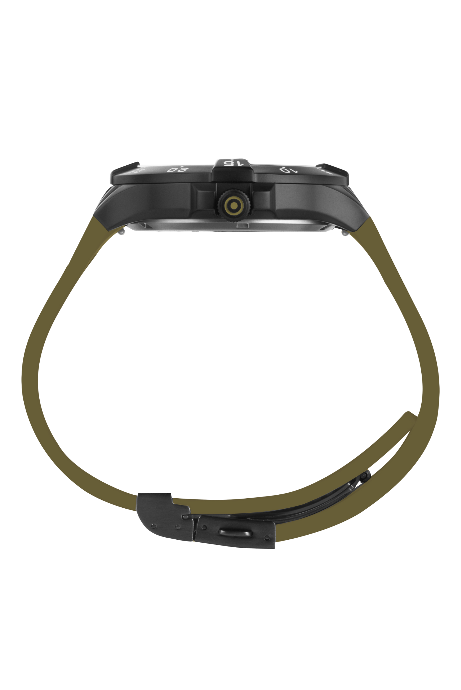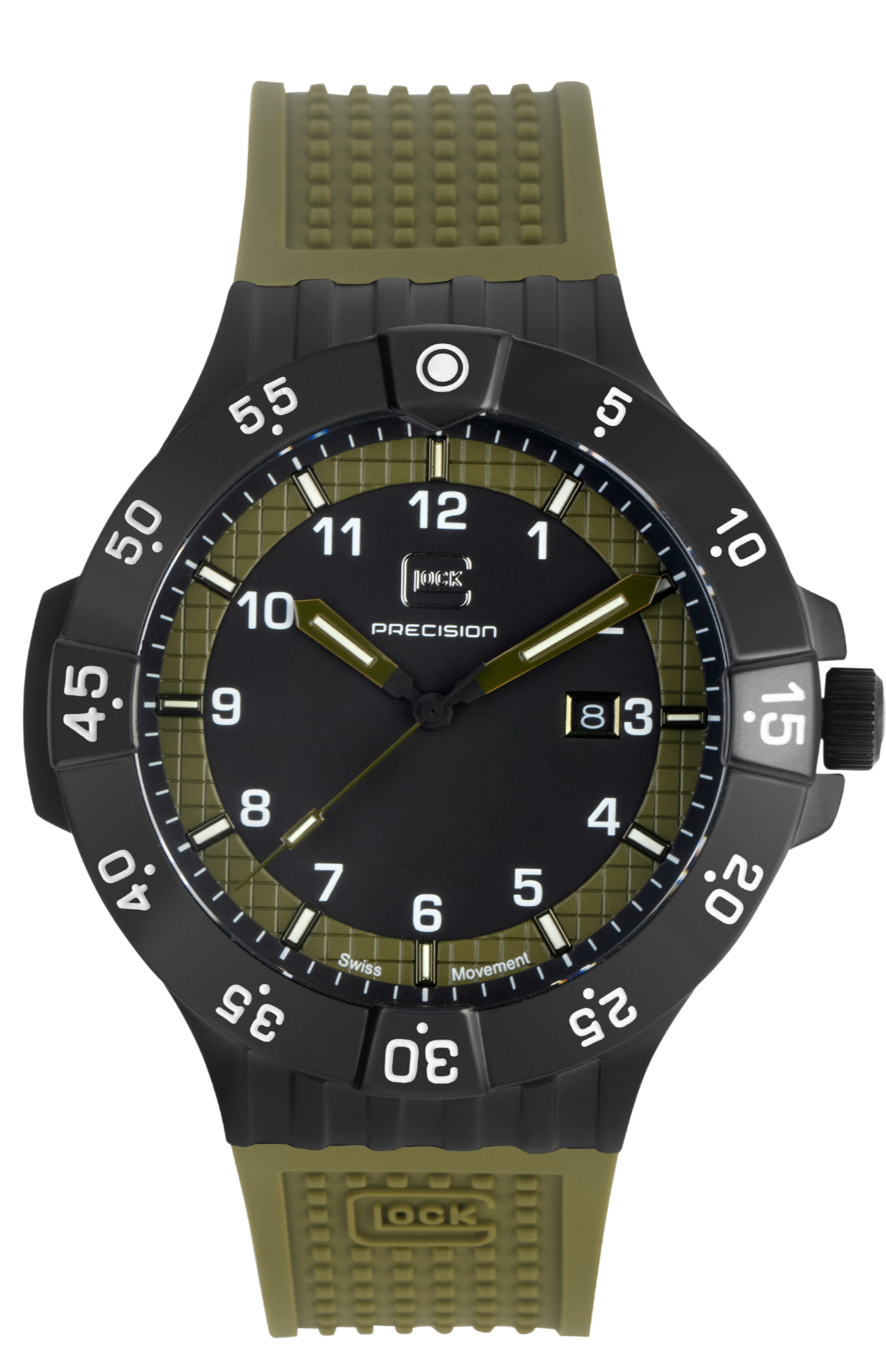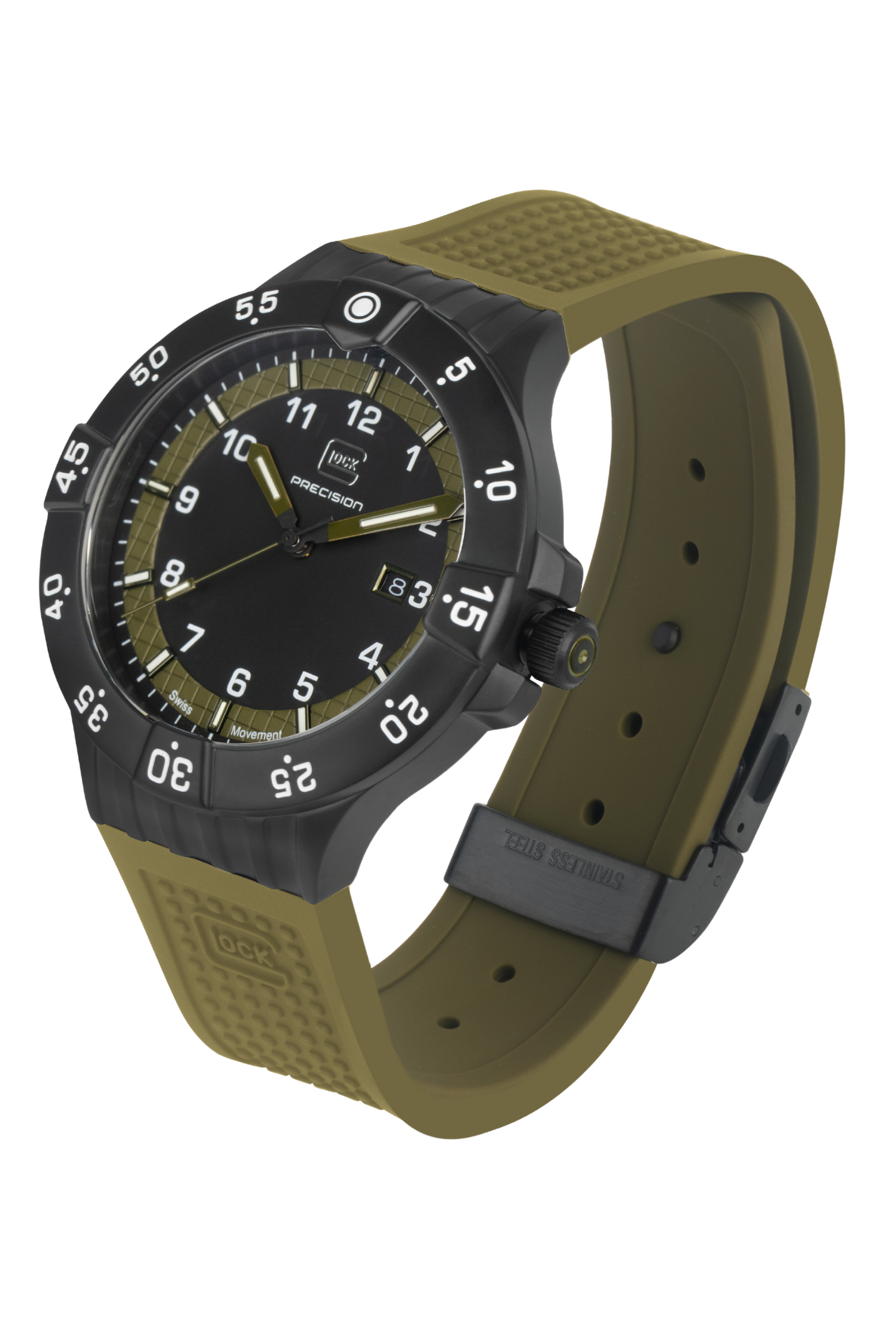 The GLOCK Quartz Model: GW-15-4-22 timepiece features Tritium lit markers ensuring constant illumination for enhanced visibility in low-light conditions. The black PVD coated case has a unidirectional coin-edged  bezel with white 60 minute markers. The 43mm sandblasted steel case with contoured ridged lugs has an army green 3D grid textured dial with smooth black center dial disc under a a scratch resistant sapphire crystal. Green luminous pencil shaped hands are surrounded by a 60-minutes track for precision timing. Equipped with a date window @3 and luminous Arabic and stick markers on outside chapter ring. An easy grip push-pull crown has GLOCK cartridge primer image etched in white between protective crown guards. Fitted with an army green GLOCK RTF textured pattern rubber silicone strap with steel pressed bi-fold deployant clasp to secure in place.