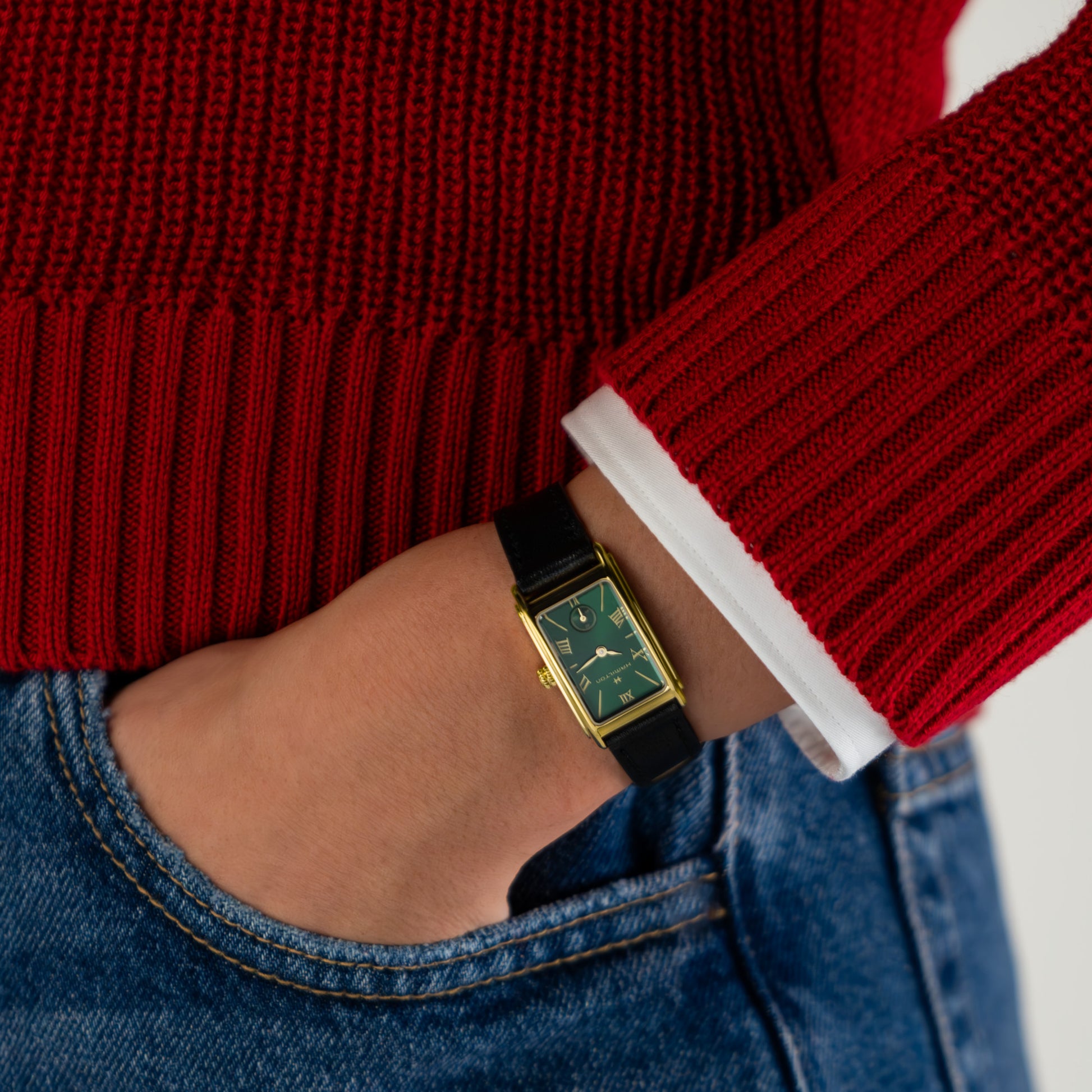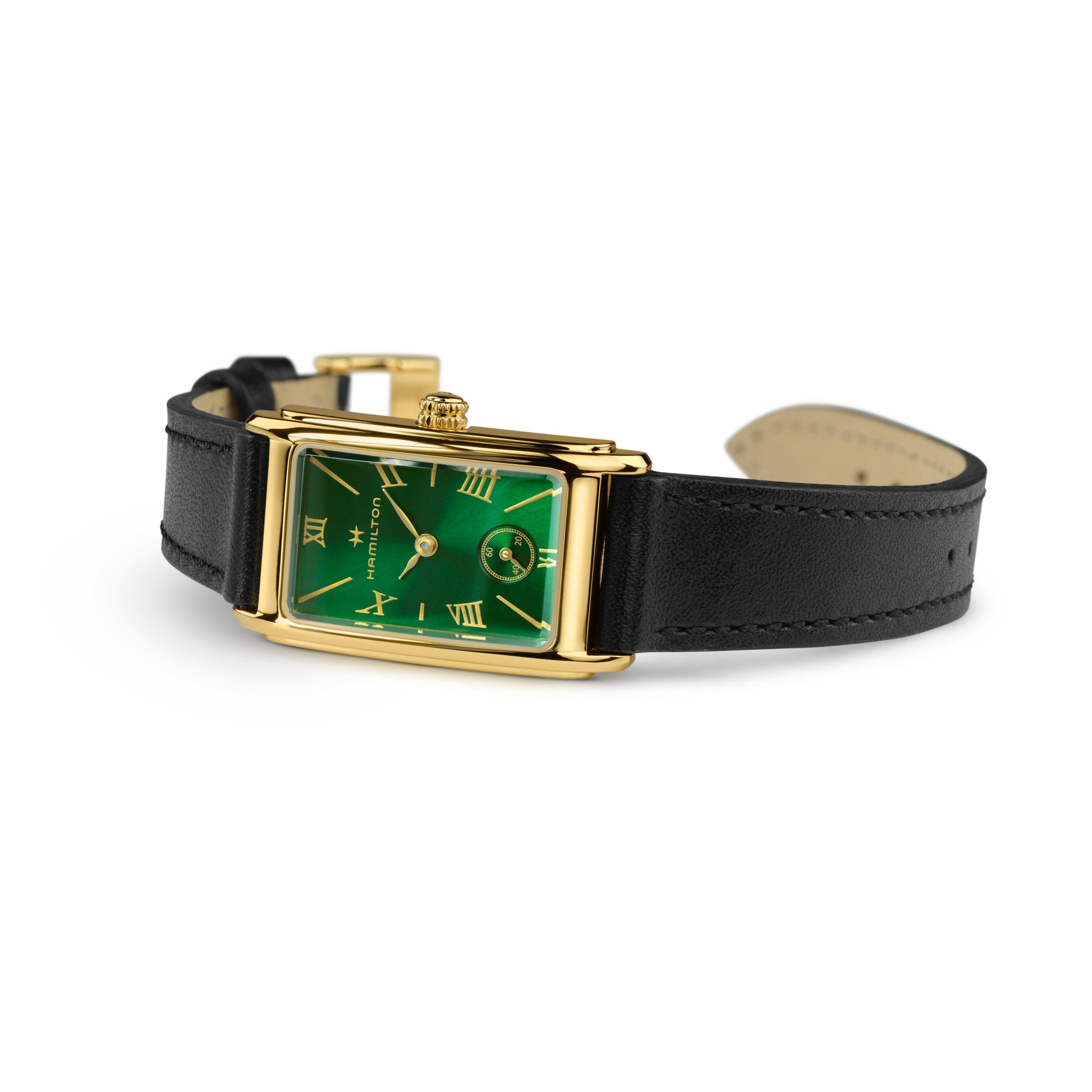 The American Classic Collection was pioneered for Hollywood's stars seen on screen by the HAMILTON brand with signature styles and timeless designs. The Ardmore Series, worn by ladies since the original 1936 Art-Deco inspired piece has remained a classic in the HAMILTON line. The quartz model #H11261760 has a polished gold-tone PVD coated stainless steel rectangular tank shaped case with a curved mineral crystal. The green sunbrushed dial has a mix of slanted and curved Roman and stick markers with polished leaf shaped hands. A small sub-seconds dial is positioned within the 6 marker. The double stacked stainless steel crown has 30 meter water resistance rating. Finished with a smooth black calf-skin leather strap with contrasting white stitch and polished gold-tone PVD coated stainless steel tang buckle with Hamilton emblem.
