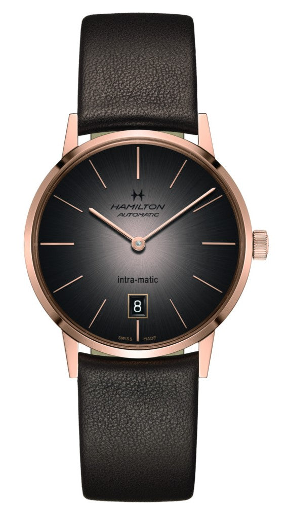 The American Classic Collection was pioneered for Hollywood's stars seen on screen by the HAMILTON brand with signature styles and timeless designs. The Intra-matic Automatic is a multi-purpose watch that can go from the office, a night out on the town, to a weekend get-away, blending vintage style with elegance and simplicity. Powered by caliber 2892-A2 which is viewable behind the exhibition case-back has a 50 hour power reserve. Model #H38465501 has a 38mm polished rose-gold PVD coated stainless steel case with a scratch resistant sapphire crystal. The grey monochrome sunburst gradient pattern dial has slim rose-tone stick markers and sleek pencil style hands with date window @6. Equipped with a polished push-pull crown with a 50 meter water resistance rating. Finished with a black calf-skin leather strap with a polished rose-gold PVD coated stainless steel tang pin buckle with Hamilton emblem.
