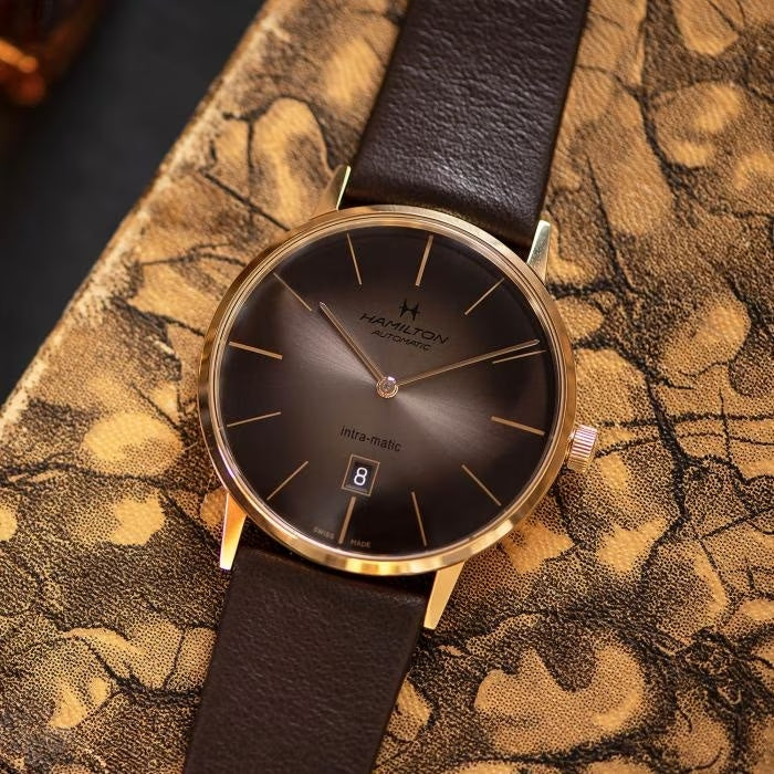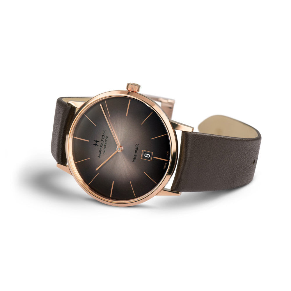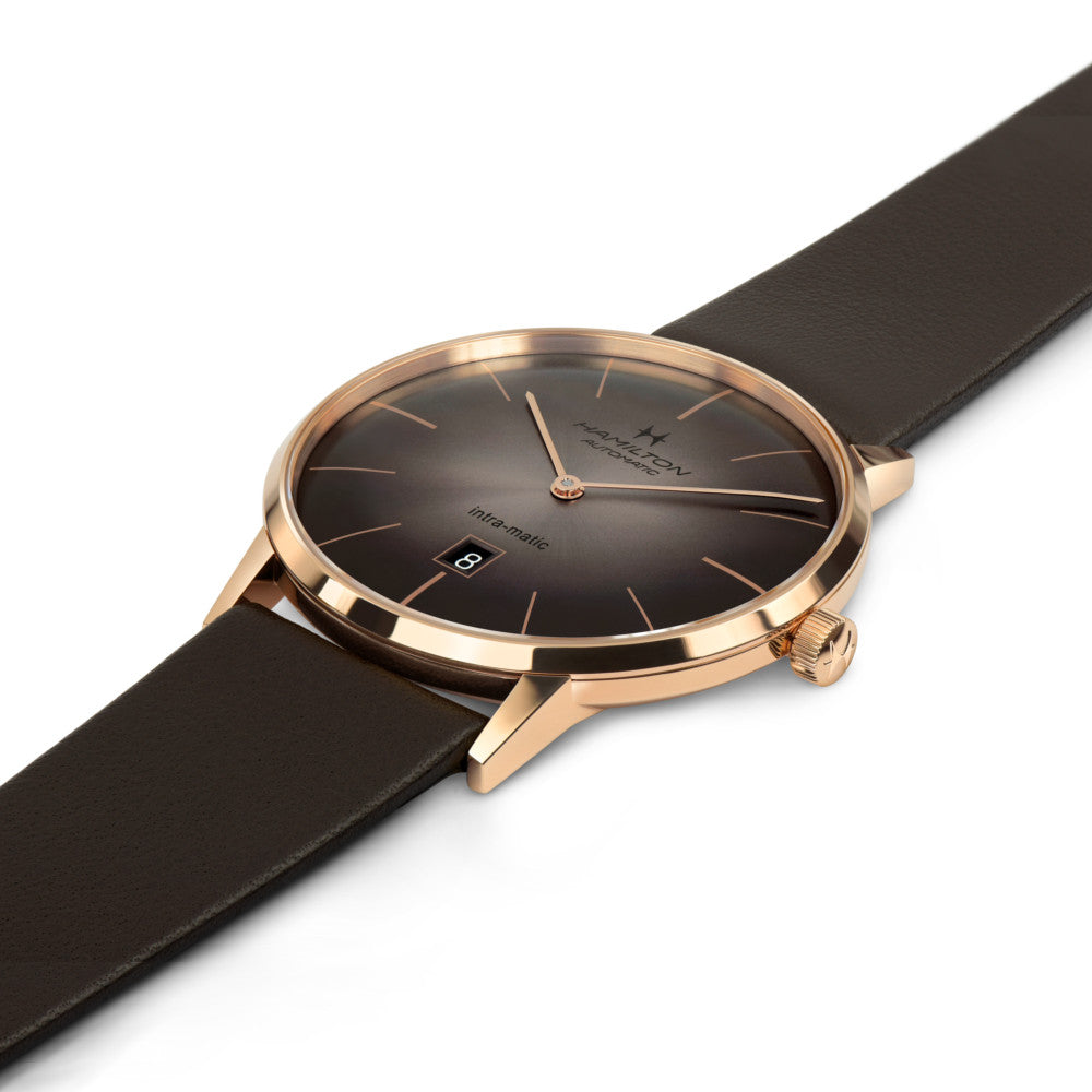 The American Classic Collection was pioneered for Hollywood's stars seen on screen by the HAMILTON brand with signature styles and timeless designs. The Intra-matic Automatic is a multi-purpose watch that can go from the office, a night out on the town, to a weekend get-away, blending vintage style with elegance and simplicity. Powered by caliber 2892-A2 which is viewable behind the exhibition case-back has a 50 hour power reserve. Model #H38745501 has a 42mm polished rose-gold PVD coated stainless steel case with a scratch resistant sapphire crystal. The grey monochrome sunburst gradient pattern dial has slim rose-tone stick markers and sleek pencil style hands with date window @6. Equipped with a polished push-pull crown with a 50 meter water resistance rating. Finished with a black calf-skin leather strap with a polished rose-gold PVD coated stainless steel tang pin buckle with Hamilton emblem.