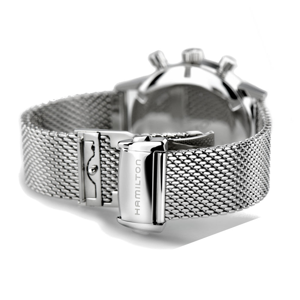 The American Classic Collection was pioneered for Hollywood's stars seen on screen by the HAMILTON brand with signature styles and timeless designs. The Intra-matic Chronograph H is part of this elite ensemble of timepieces, with elegant sporty sophistication without compromising its practical functionality. Featuring the exclusive handwound H-51 caliber movement, with an impressive 60 hour power reserve. the bi-colored Panda style Model #H38429110 has a 40mm polished stainless steel case with soft white satin dial under a scratch resistant box-shaped anti-reflective sapphire crystal. Luminous applied patina markers and pencil style hands are surrounded by a tachymeter track on outer dial. Equipped with black chevron style pattern 30 minute subdial @3 and 60 second sub-second @9. The easy grip oversize stainless steel crown with polished pushers has a 100 meter water resistance rating. Finished with a polished Milanese stainless steel bracelet with twin push button bi-fold deployant clasp with Hamilton emblem.