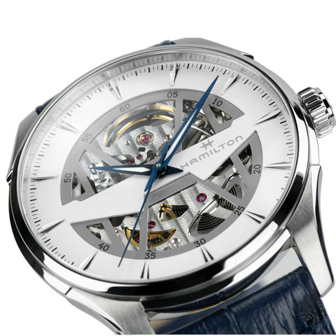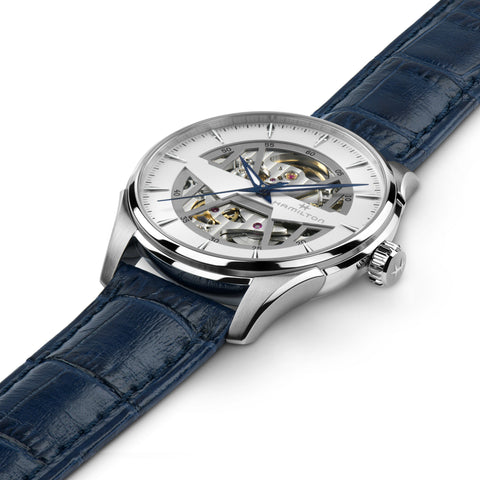 The Jazzmaster by the Hamilton Brand is a line of contemporary modern timepieces made with refined, quality craftsmanship. The automatic skeleton wrist watch features  an "H" shaped precision cut-out to showcase the interior case movement within. With an impressive 80 hour power reserve, the reliable and accurate H-10-S caliber movement is also viewable behind an exhibition case-back. Model #H42535610 has a 40mm polished stainless steel case with a scratch resistant sapphire crystal. The white dial has diamond shaped markers with inconspicuous numerals surrounded by a minutes track. Equipped with slim luminous dauphine style hands and easy grip polished crown with 50 meter water resistance rating. Finished with a blue alligator grained leather strap with matching stitch signed with stainless steel tang pin buckle with Hamilton emblem.