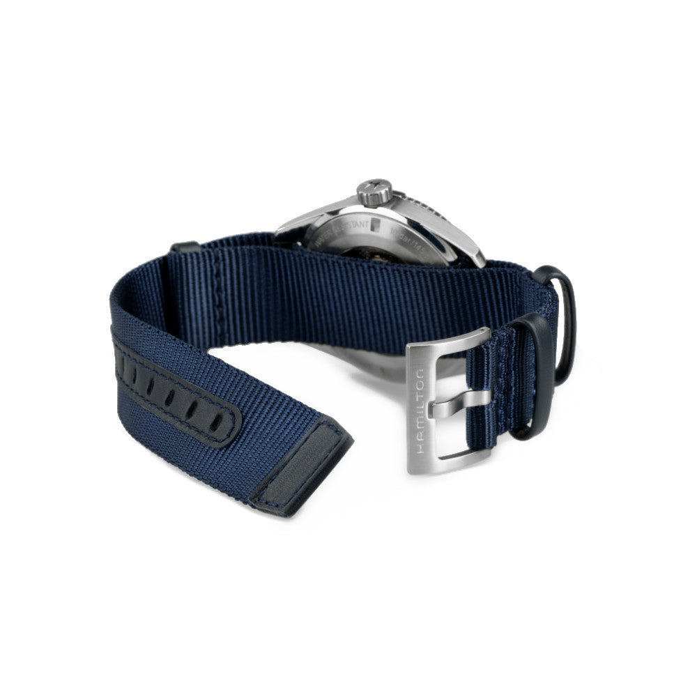 The new Expedition from the HAMILTON Brand is inspired by the Khaki Field wrist watch with rugged durability and classic style for your all-terrain adventures. Featuring a compass bezel design enabling you to navigate directions with the help of the sun. Fitted with the reliable and accurate H-10 caliber movement, viewable behind an exhibition case back with an impressive 80 hour power reserve. The Khaki Field Expedition, model #H70315940 has a compact 41mm brushed and polished stainless steel case with scratch resistant sapphire crystal. Equipped with a robust easy-grip stainless steel screw-down crown with 100 meter water resistance rating. The blue satin dial has white Arabic numerals and luminous patina syringe style hands surrounded by a luminous minutes track on outer dial disc. Finished with a blue NATO style nylon strap with brown leather accents and stainless steel tang buckle signed with HAMILTON insignia.