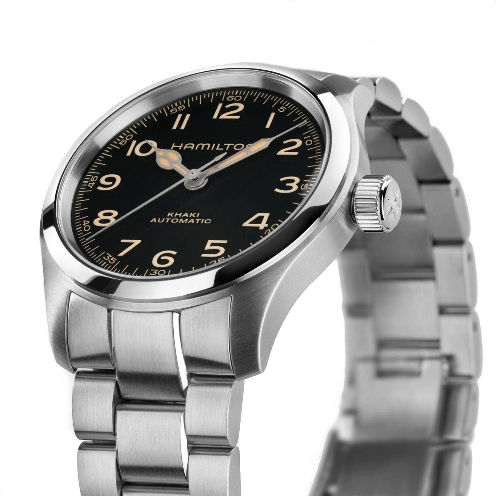 The Khaki Field from the HAMILTON Brand is a military inspired wrist watch with rugged durability and classic style. Extending the "Murph" Collection originally featured in the sci-fi hit movie Interstellar with actor Matthew McConaughey, now available in two new version inspired by the original. Equipped with the reliable and accurate mechanical H-10 caliber movement with an impressive 80 hour power reserve viewable behind an exhibition case-back. Model #H70405130 has a 38mm brushed and polished stainless steel case with a scratch resistant sapphire crystal. The satin black dial has radium-colored Super-LumiNova® Arabic numerals and cathedral style hands surrounded by a minutes track on outer dial. The push-pull easy grip oversize crown has a 100 meter water resistance Finished with 3-link stainless steel bracelet with twin push button bi-fold clasp with Hamilton insignia.