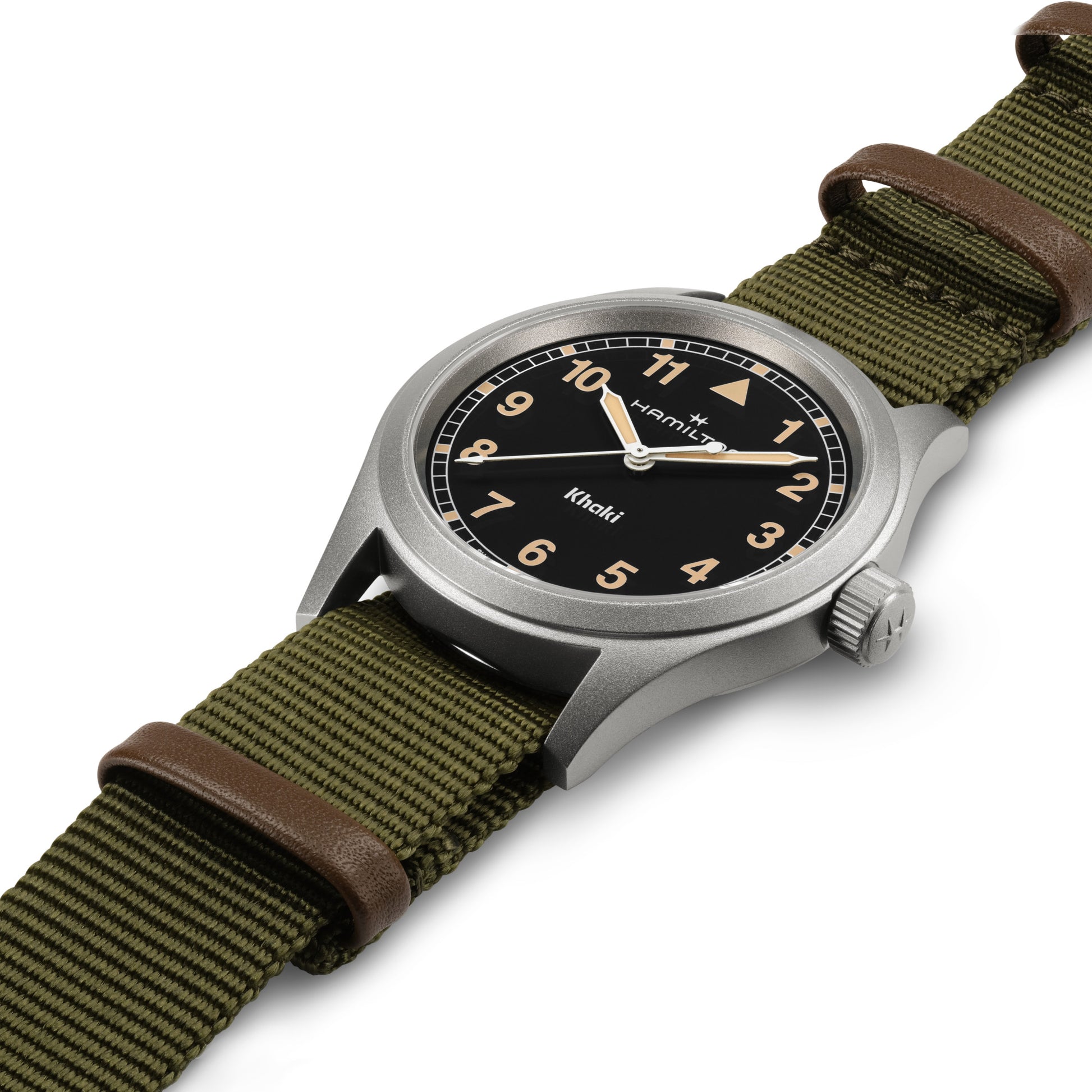 The Khaki Field Quartz from the HAMILTON Brand is military inspired wrist watch with utility-focused design and classic simple style. Model #H69401930 has a compact 38mm matte stainless steel case that is battery operated. The vintage matte black dial features straight easily legible luminous Arabic numerals surrounded by a minutes railroad track. Syringe style hands with radium-colored Super-LumiNova® indexes are viewable behind a scratch resistant sapphire crystal. Fitted with a robust easy-grip stainless steel crown with 50 meter water resistance rating. Finished with a khaki green NATO style strap with brown leather accents and stainless steel tang pin buckle.