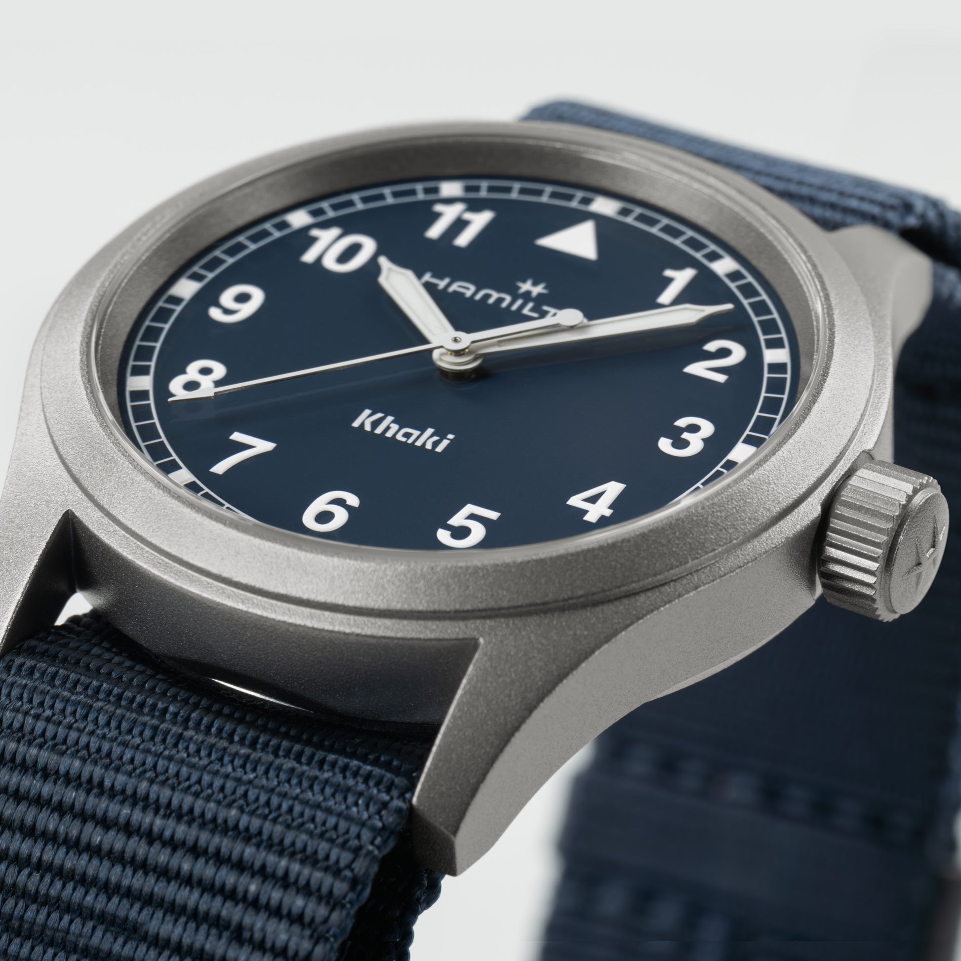 The Khaki Field Quartz from the HAMILTON Brand is military inspired wrist watch with utility-focused design and classic simple style. Model #H69401940 has a compact 38mm matte stainless steel case that is battery operated. The vintage matte blue dial features straight easily legible luminous Arabic numerals surrounded by a minutes railroad track. Syringe style hands with Super-LumiNova® indexes are viewable behind a scratch resistant sapphire crystal. Fitted with a robust easy-grip stainless steel crown with 50 meter water resistance rating. Finished with a blue NATO style strap with blue leather accents and stainless steel tang pin buckle.