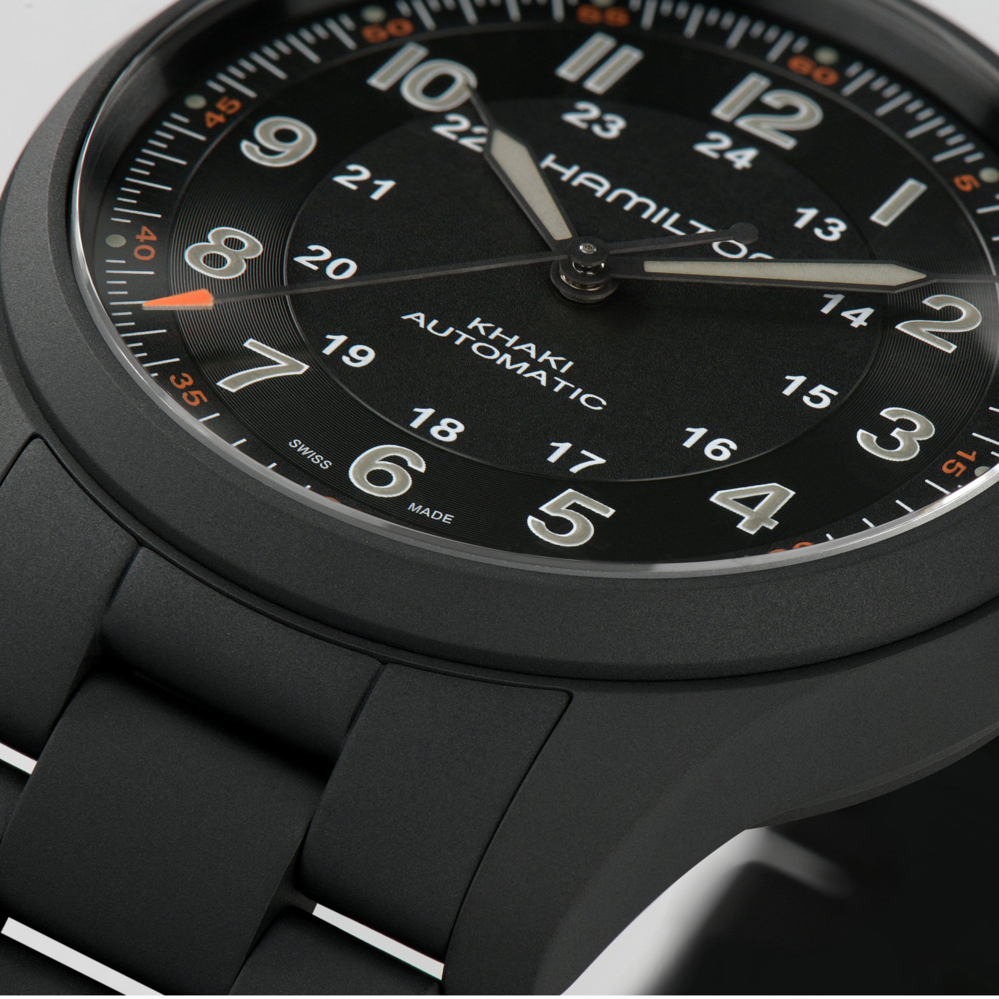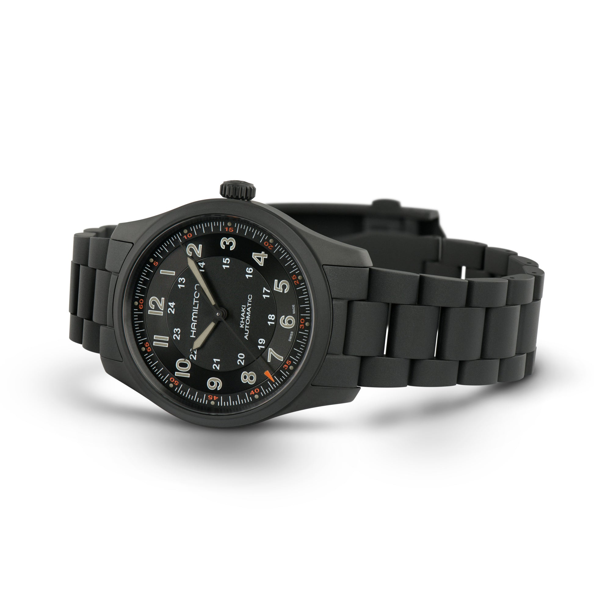 The Khaki Field Titanium Automatic from the HAMILTON Brand is a military inspired wrist watch with rugged durability and classic style. Featuring the reliable and accurate H-10 caliber movement, viewable behind an exhibition case back with an impressive 80 hour power reserve. Model #H70215130 has a 38mm black PVD coated titanium case with a scratch resistant sapphire crystal and 100 meter water resistance. The black satin dial has Arabic patina numerals and black luminous syringe style hands surrounded by a minutes track on outer dial. Equipped with both 12 and 24-hour time via two separate index rings. Finished with 3-link brushed sandblasted PVD coated titanium bracelet with twin push button bi-fold clasp with Hamilton insignia.
