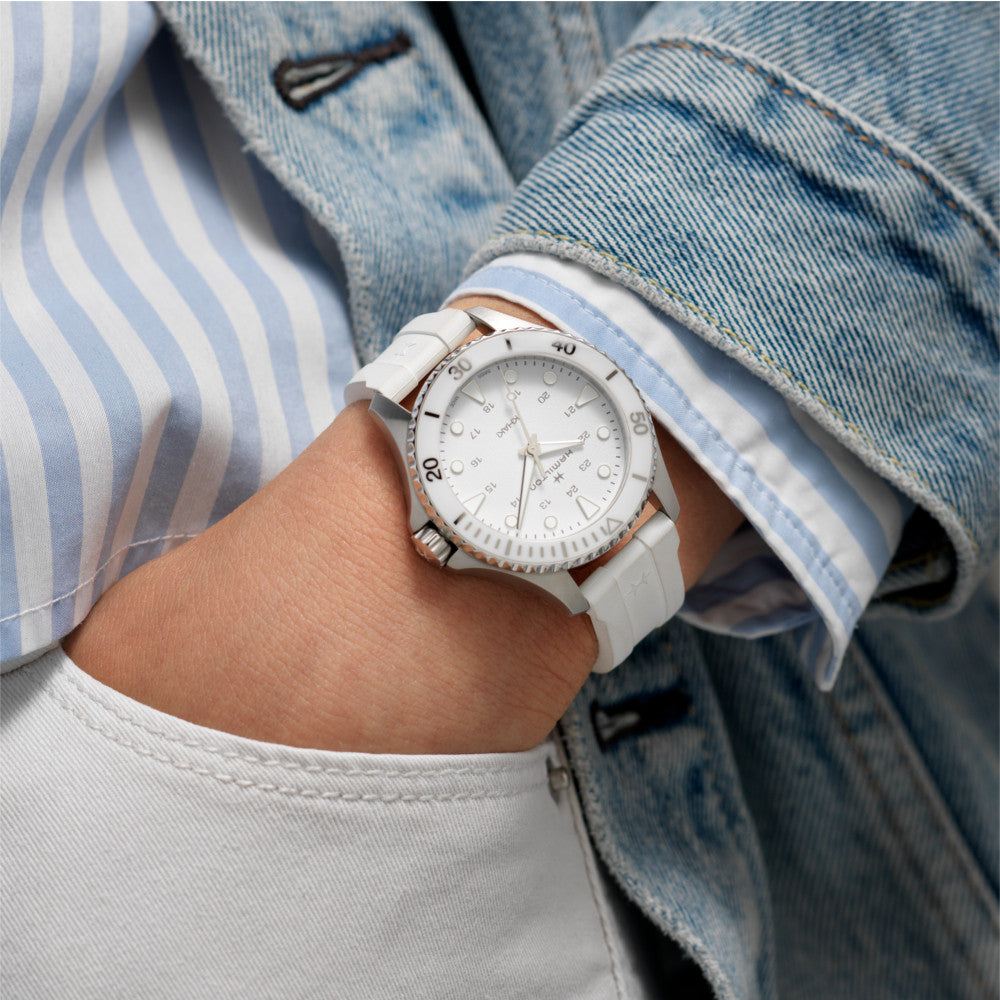 • White ceramic rotating unidirectional coin-edge diving bezel