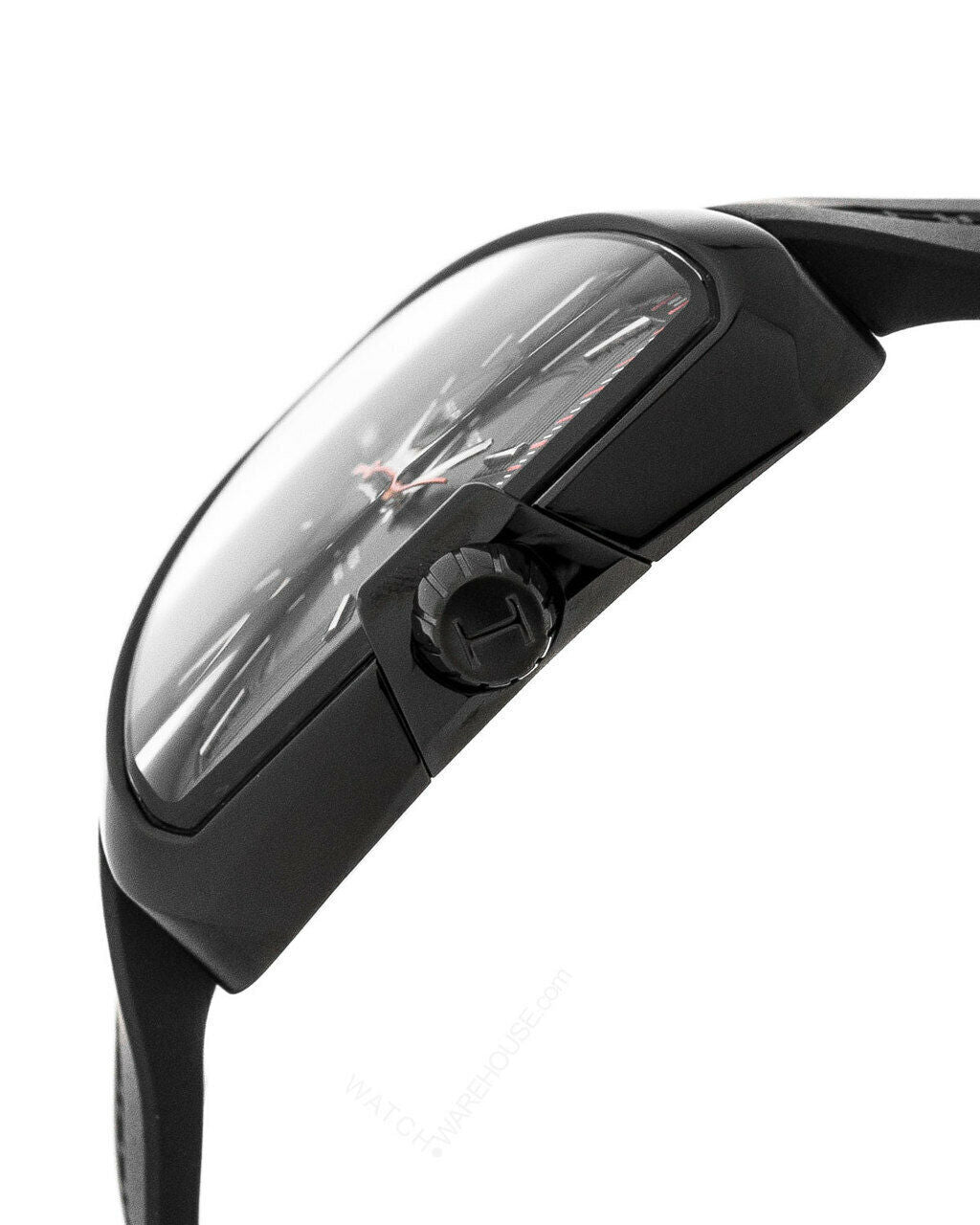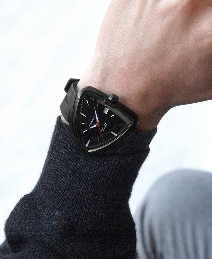 The Ventura Collection is one of Hamilton's most iconic and eclectic wrist watches since 1957.  Known as the watch Elvis wore with its unusual triangular shape and unconventional design, still has charm and enduring legacy today. The automatic features the reliable and accurate H-10 caliber movement, (viewable behind an exhibition case-back) with an impressive 80 hour power reserve in tribute to what would have been Elvis's 80th birthday.  Model #H24585331 has a triangular 42.5mm black PVD coated stainless steel case with a scratch resistant sapphire crystal. The black textured dial has luminous stick markers and sword style hands surrounded by a minutes track with orange accents.  Equipped with with date window @3 with domed crown and 50 meter water resistance. Finished with a black rubber strap signed with black PVD coated stainless steel tang pin buckle with Hamilton emblem.