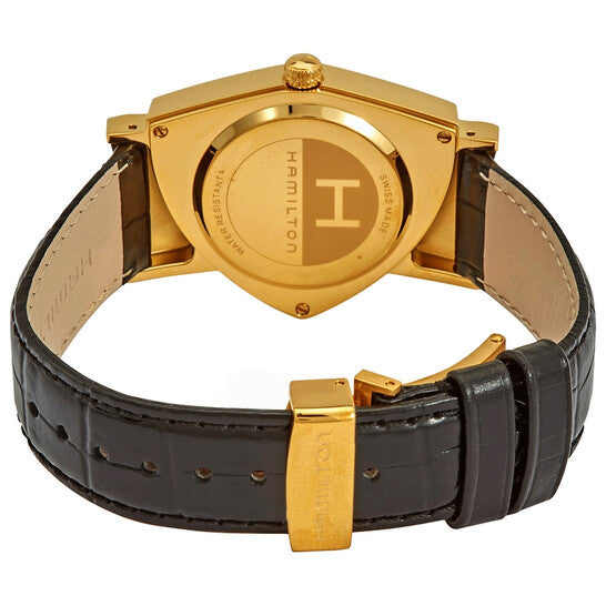 The Ventura Collection is one of Hamilton's most iconic and eclectic wrist watches since 1957.  Known as the watch Elvis wore with its unusual triangular shape and unconventional design, still has charm and enduring legacy today. The quartz model #H24301731 has a triangular 32.3mm polished yellow tone stainless steel case with winged bezel and mineral crystal. The black dial has a gold-tone zig-zag pattern across the face with polished sword style hands surrounded by circular stick markers. Finished with a black leather lizard grained calf-skin strap with matching stitch signed with stainless steel tang pin buckle with Hamilton emblem.