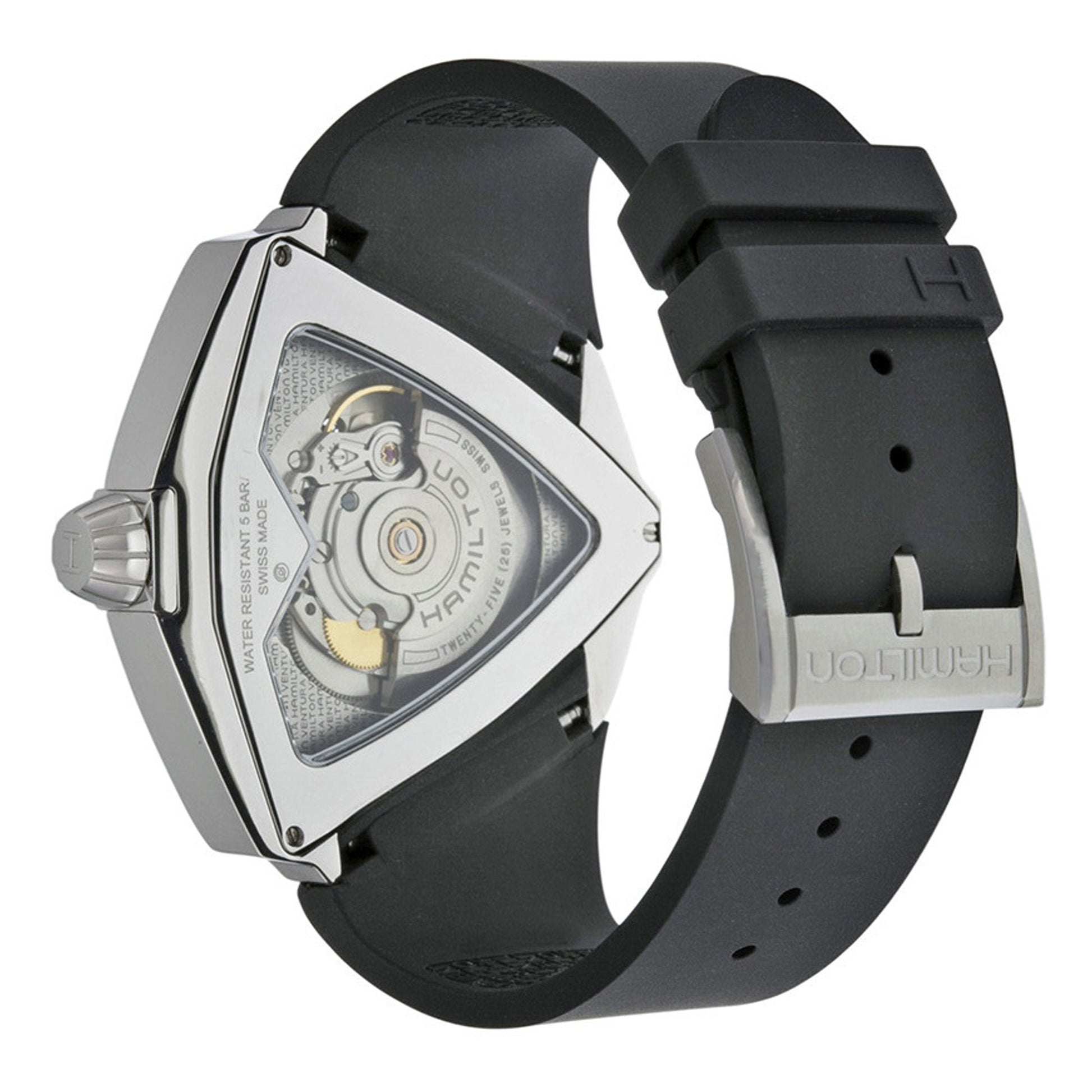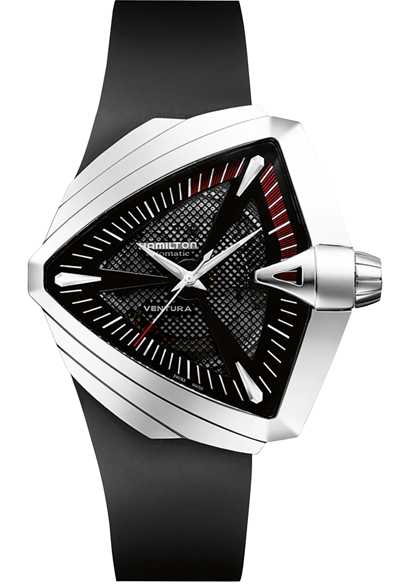 The Ventura Collection is one of Hamilton's most iconic and eclectic wrist watches since 1957.  Known as the watch Elvis wore with its unusual triangular shape and unconventional design, still has charm and enduring legacy today. The automatic features the reliable and accurate H-10 caliber movement is viewable behind an exhibition case-back with an impressive 80 hour power reserve. Model #H24655331 has an oversized triangular 45.5mm polished stainless steel case with a scratch resistant sapphire crystal. The XXL black partially transparent dial gives a slight glimpse of the movement inside. Luminous polished sword style hands and slim red tipped seconds hand is surrounded by a minutes track with matching accents of red. Equipped with modern avant-garde pointed bullet shaped domed crown and 50 meter water resistance. Finished with a black rubber strap signed with a stainless steel tang pin buckle with Hamilton emblem.