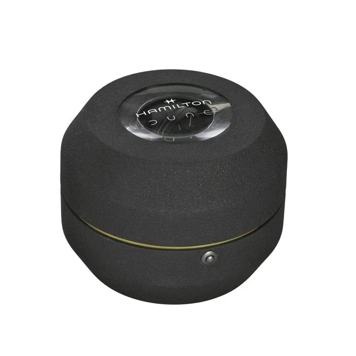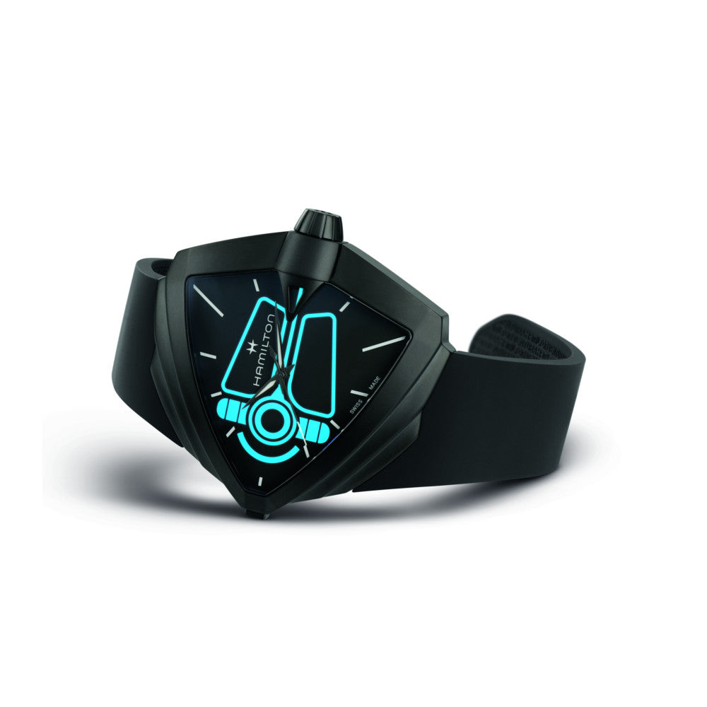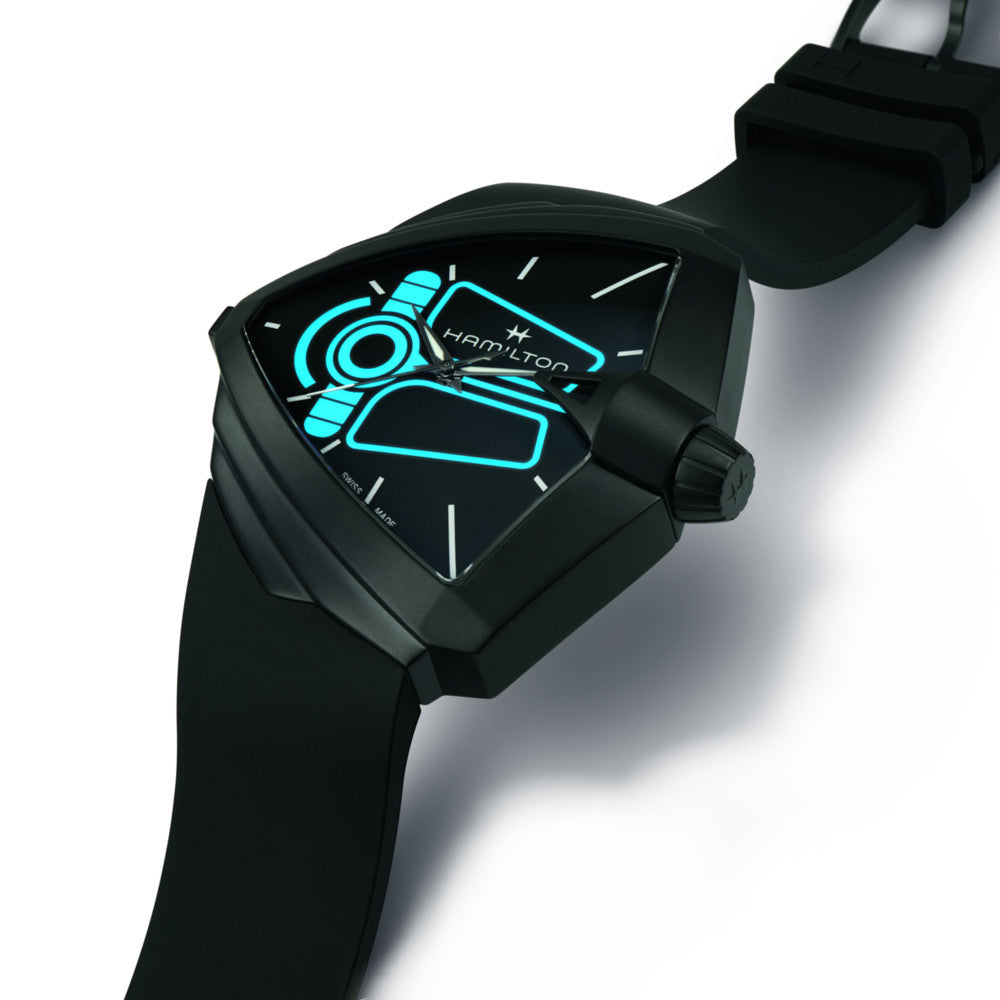 Inspired by the Arrakis dessert watch featured in the new "Dune: Part Two" movie from filmmaker Denis Villeneuve's, the Ventura XXL Bright, is a limited edition piece of 3000 made and part of a two piece Collection. The quartz model #H24614330  has an oversized triangular 52mm polished black PVD coated stainless steel case with a scratch resistant sapphire crystal. The XXL black dial replicates the dessert watch design from the movie across the face that light up digitally in blue with the push off a button. Luminous sword style hands with white-tipped seconds hand are surrounded by stick markers. Equipped with modern avant-garde pointed bullet shaped domed crown and 50 meter water resistance rating. Finished with a black rubber strap with a stainless steel tang pin buckle closure with Hamilton emblem. This limited edition piece comes with specialty commemorative packaging inspired by the film that fans of the films and books, as well as collectors, won’t want to miss!