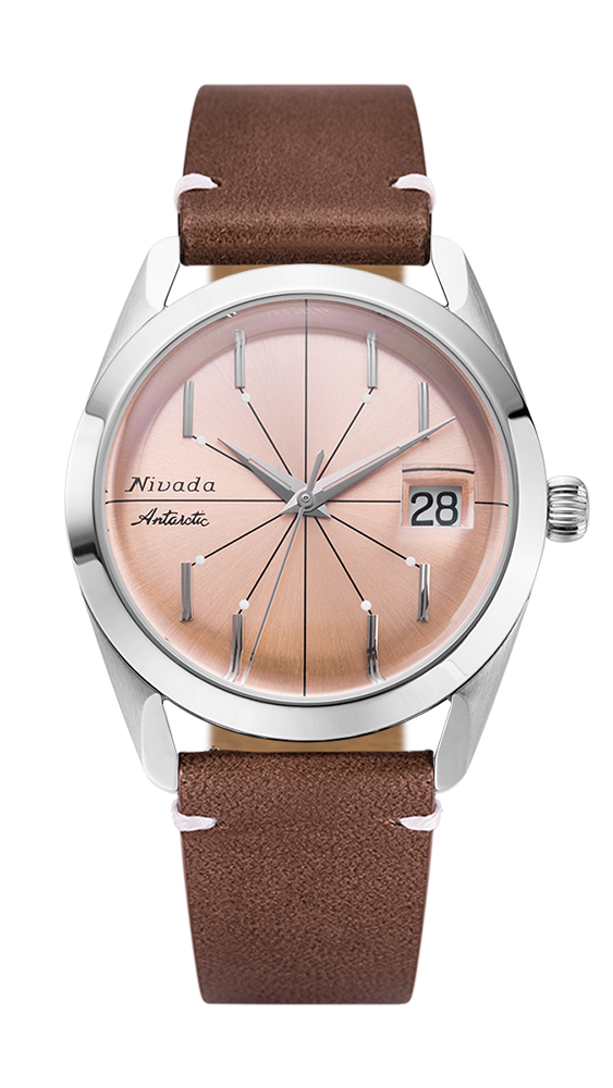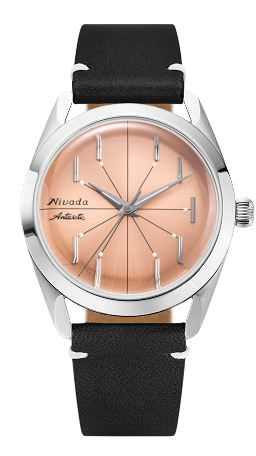 The Antarctic Spider Collection from the Swiss brand Nivada Grenchen still gets its roots from the original Antarctic timepiece worn by the American Navy Deep Freeze 1 Task Force during their South Pole expeditions. This modern interpretation has a slight twist with an eclectic spiderweb like dial design that brings that same vintage 1950's style with modern elements and esthetics. Housed in a 38mm stainless steel case sunray brushed salmon dial with option for no-date or magnified date window @3. Featuring center front, luminous tipped crosshair spiderweb like design jetting out to applied faceted stick straight vertical indices. Elegant polished silver luminous dauphine style hands with sweep seconds are easily legible under a domed anti-reflective sapphire crystal. Powered by Soprod P024 automatic Swiss-made self-winding movement with 38 hour power reserve. Fitted with corrugated screw-down dome shaped crown with 100 meter water resistance rating to prevent dirt and water intrusion. This piece comes in several watch band options from stitched calf-skin leather, racing perforated style, rubber tropic textured weave to stainless steel 3-link bracelet or the beads of rice option.