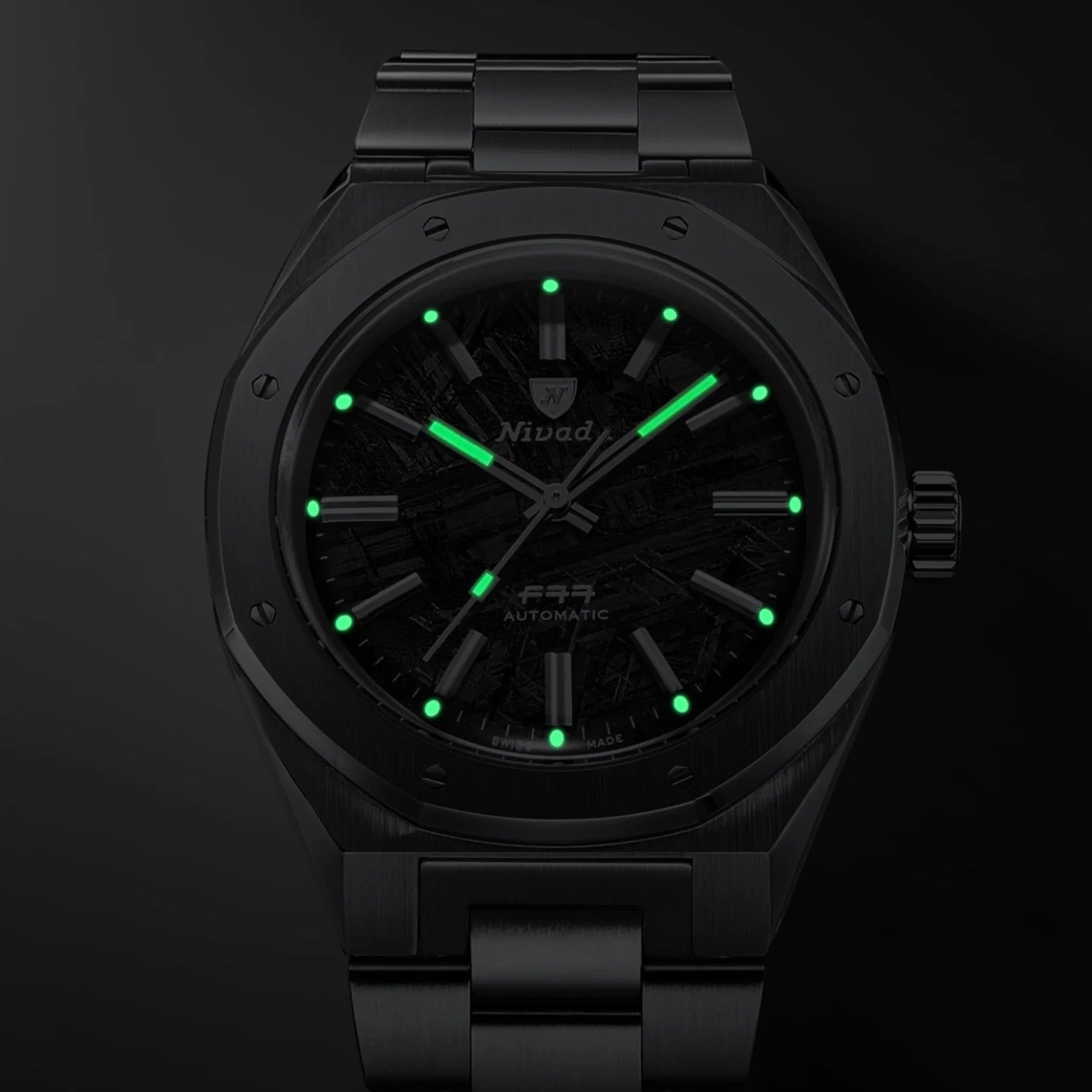 Staying true to its roots, the F77 Collection is a reissue of the 1977 classic timepiece from the Nivada Grenchen brand. Simply sport chic, with integrated bracelets on sleek modern shaped cases in 4 new dials; lapis lazuli, titanium meteorite, anthracite & dark blue aventurine, in stainless steel, ceramic or light-weight titanium. Now housed in a larger more robust 41mm stainless steel case with 8 pin-screw accent detail octagon shaped bezel. Featuring a genuine meteorite dial with unique metallic grey geometric patterns, distinct, ensuring that no two watches are identical. Luminous polished silver baton shaped hands and faceted applied markers with date or no-date versions are easily legible under a domed anti-reflective sapphire crystal. Powered by Soprod P024 automatic Swiss-made self-winding movement with 38 hour power reserve. Fitted with polished corrugated screw-down crown with 100 meter water resistance rating to prevent dirt and water intrusion. This piece comes in a stainless steel 3-link integrated bracelet or black Velcro canvas strap.