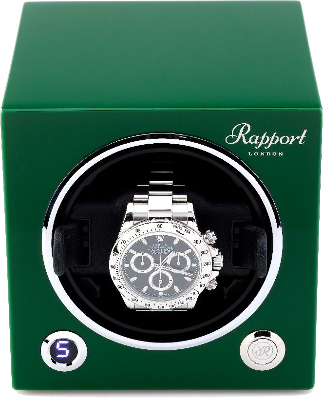 The Evolution Series by Rapport of London is a simplistic but versatile watch winding system. The EVO44 is programmable with 9 winding functions that rotate clockwise, counter-clockwise and bi-directional. Finely finished with several coats of high gloss lacquer, the single unit case is accented with silver chrome hardware. The open face design will accommodate watches up to 75mm in size with a soft scratch-free rubber support to keep your timepiece protected and in place. The watch winding program runs virtually silent and is powered by an AC adapter with backup battery function.