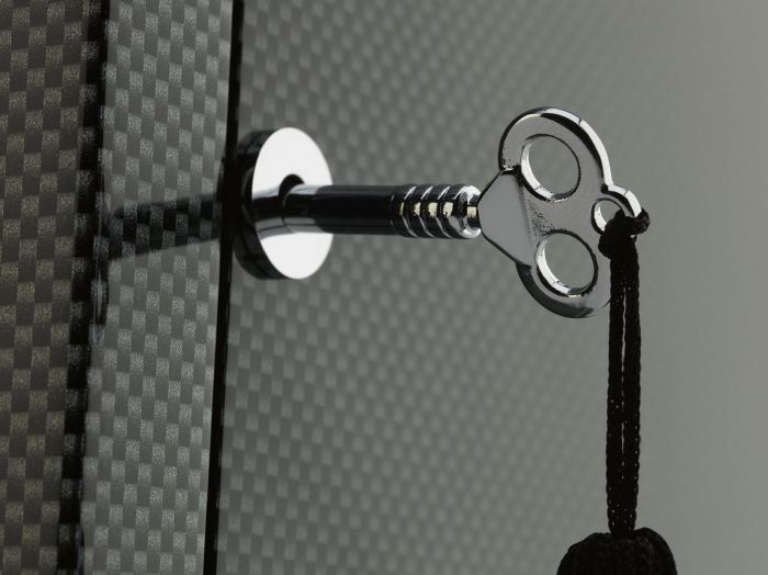 The Formula Collection W562 by Rapport of London is a handcrafted elegant winding series with modern design. This advanced two-unit watch winding system easily displays the progress and winding function of your watch via an LCD touch screen panel. This finely finished case is of genuine wood construction in a sporty carbon fiber finish with polished chrome accents. Your items are protected and viewable behind a key lockable glass door with LED lighting.  The interior is lined in soft velveteen fabric with removable watch arms that fully adjust to accommodate any size wrist watch to keep your watches secure and in place.