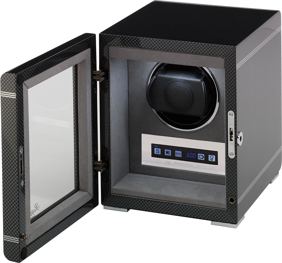 The Formula Collection W561 by Rapport of London is a handcrafted elegant winding series with modern design. This advanced watch winding system easily displays the progress and winding function of your watch via an LCD touch screen panel. This  finely finished case is of genuine wood construction in a sporty carbon fiber finish with polished chrome accents and solid glass door to display and protect your fine timepiece. The interior is illuminated with an LED light and is covered with a soft velveteen fabric. The removable watch arm fully adjusts to accommodate any size wrist watch with a soft leather cushion that keeps your watch protected and in place.