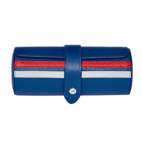 The Greenwich Collection by the RAPPORT of London brand pays tribute to the United Kingdoms heritage with colors in honor of the "Union Jack" flag.  Classic and sleek style, the triple watch roll is covered in a rich blue calf-skin leather, with accents of red and white striped trim. Lined in a soft velveteen finish with removable compressible cushion roll to keep up to three watches protected and scratch free. Equipped with leather strap and polished chrome snap button closure to secure your item in place during transport, making it the perfect travel companion for your fine timepiece.