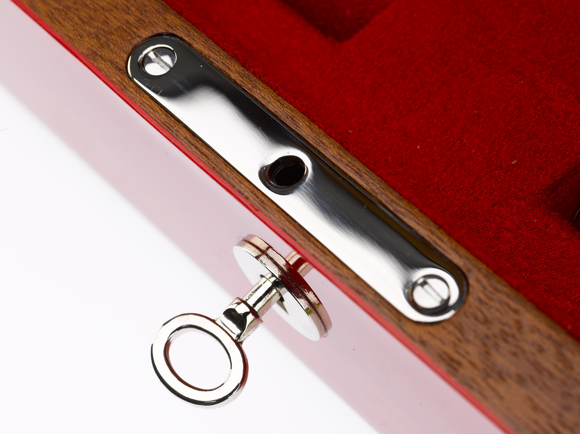 The Labyrinth Series by Rapport of London is a collection of lockable luxurious artisan wooded watch and storage boxes with rich colorful patterned designs and finishes. The L444 is a ten-unit finely crafted collector wood watch case with a rich red stained finish, layered with several coats of hi-gloss lacquer and complete with a black "labyrinth" design pattern. The quadrant hinged lid is key lockable and fitted with polished chrome hardware. The interior has ten individual compartments that are lined in a luxurious soft suede with removable padded cushions to keep your watches protected and in place.