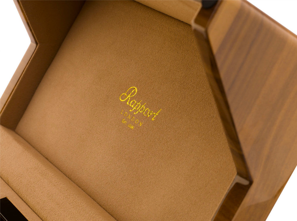 The Perpetua Series 3 W582 by Rapport of London is a hand crafted winding system with classic and traditonal design.  The double unit watch winder is constructed of walnut wood with a luxurious gloss lacquered finish. A hinged lid and polished chrome accents with elegant footed feet will safely stow your valuable timepiece. The interior case is covered in a soft velveteen finish with removable leather watch arms that fully adjust to accommodate any size wrist watch.