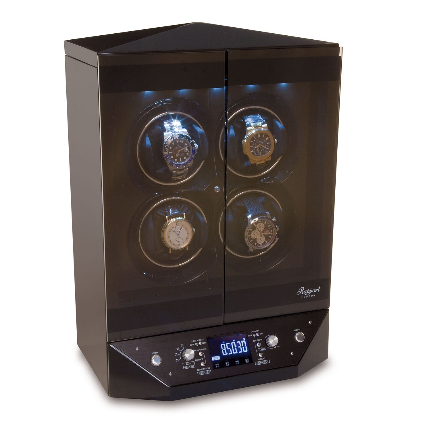 The Templa LED W300 by Rapport of London is an advanced 4 unit watch winder which displays the progress and winding function of your watch that is easily readable with LED lights. This finely finished case is of solid wood construction in a piano-finish Ebony fitted with a  electronically powered smoked glass sliding doors that beautiful displays and protects your fine timepiece collection. The interior is illuminated with an LED light. The interior case is covered in a soft velveteen finish. The removable watch arms fully adjust to accommodate any size wrist watch with soft leather cushions and plastic clips to keep your watches in place.The exterior LCD display control panel individually programs and adjust the speed,direction and duration of rotations needed.