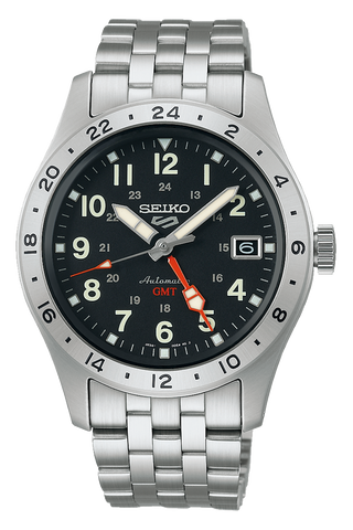 The NEW SEIKO 5 Sports Collection is inspired by the "trench" watch, these vintage military pieces were once worn in the field. Created to be robust, reliable and designed with all the characteristics known from the Seiko 5 Sports line with manual wind capacity and hack function for precision setting but now featuring a GMT function. The automatic 39.4mm brushed and polished stainless steel case has a black satin dial with brushed 24 hour bezel behind a curved hardlex crystal. Equipped with both 12 and 24-hour military time with luminous Arabic numerals makes for easy readability at a glance. Luminous baton style hands with orange accented seconds and GMT hand is surrounded by a minutes track on outer dial. A date window is located @3 with push-pull easy-grip stainless steel crown with 100 meter water resistance capacity. Powered by Seiko's own in-house-made automatic caliber 4R34 movement viewable behind the exhibition case-back with 41 hour power reserve. Fitted with a stainless steel brushed and polished 5-link bracelet with deployant clasp with Seiko insignia .