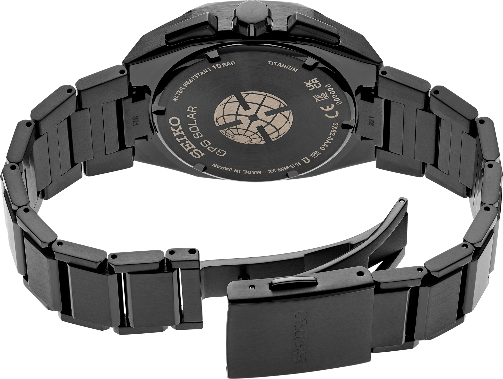 With angular faceted, bezel, textured dimensional dials and integrated bracelet, Astron's SSJ015 is part of the new 2023 caliber 3X62 series. Featuring GPS high-speed signal receptions, charging status, leap second data receipt, and in-flight mode, you can be assured you will have the most accurate time anywhere in the world in any time zone. Composed of super light-weight hard coated and durable black PVD titanium the 41.2mm case and bracelet are integrated with a black textured stacked brick patterned dial surrounded by a minutes track. Luminous sword style hands and raised stick markers are easily legible behind a dual curved super-clear coated anti-reflective sapphire crystal. Equipped with date window nestled within the 3 and in-flight mode, DST, leap year and power reserve indicator sub-dial @9. The polished push-pull crown has a water resistance rating of 100 meters with polished and brushed pushers for sub-dial indicator modes. Your watch is secured with a twin push button tri-fold safety clasp with Seiko embossed insignia on a polished and brushed integrated stainless steel 3-link bracelet.
