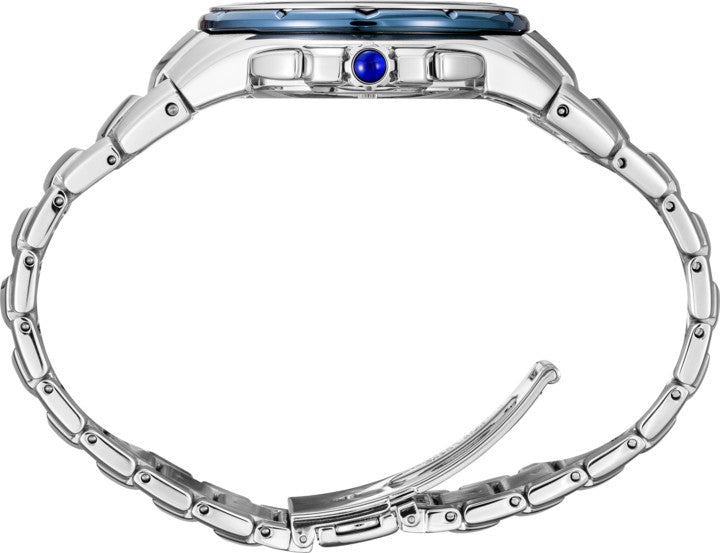 The polished stainless steel two-tone 44mm case has a white dial with a stylish brilliant blue notched bezel. The luminous blue skeleton sword style hands and applied markers are easily legible. Perpetual calendar days grace the outer chapter ring which adjust for odd and even months including leap year. The multi-function split black central sub-dial shows your power reserve, alarm function as well as the day of the week, and leap year indicator. The chronograph measures up to 60 minutes in 1/5- second increments with a split time measurement function and stopwatch. Bright blue and black accentuates throughout the white dial with small 24-hr sub dial @6 and small minutes @9. Powered by light with no battery needed with a 6-month power reserve and a Seiko's own caliber movement V198. With a 100 meter water resistance, the screw down stainless steel cabochon crown is protected by a crown guard with polished chrono pushers on each side.  The screwed down brushed and polished stainless steel case back is signed with the Seiko name and fitted with a sapphire crystal front. The polished and brushed tapered raised link chevron style stainless steel bracelet has a twin push button tri-fold safety clasp to keep secure and in place.