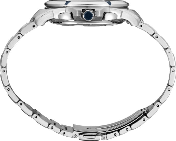 • Polished stainless steel blue jeweled cabochon screw-down crown with crown guard