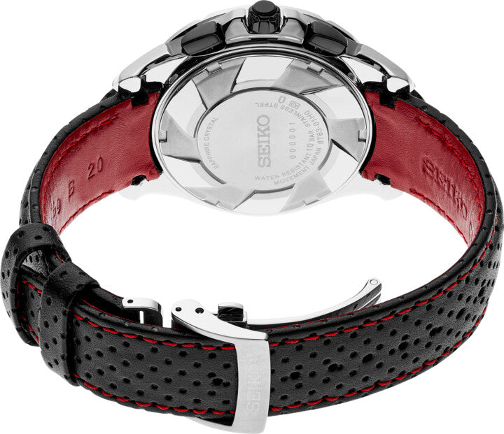 The Coutura Collection from SEIKO is a diverse timepiece with the looks of a dress watch and practical functionality of a sports piece. Inspired by motor sports racing, the new case and bracelet design incorporates angles and edges reminiscent of a racecar. The SSB435 quartz chronograph measures up to 60 minutes in 1/5-second increments with a split time measurement function and stopwatch. The polished stainless steel 42mm case has a red carbon fiber patterned dial with grooved black accented bezel. A screw down stainless steel cabochon crown with jewel insert is protected by a crown guard between polished chrono pushers. Luminous skeleton diamond shaped hands and markers with white chrono hand are viewable behind a sapphire crystal. The chronograph features small seconds located centrally @6 with 24-hr sub-dial @3 and sub seconds @9. Powered by Seiko's own quartz caliber movement 8T63 with date function and 100 meter water resistance. Like vintage driving gloves, the black perforated two-tone leather strap with polished stainless steel tang buckle will keep your watch secure.