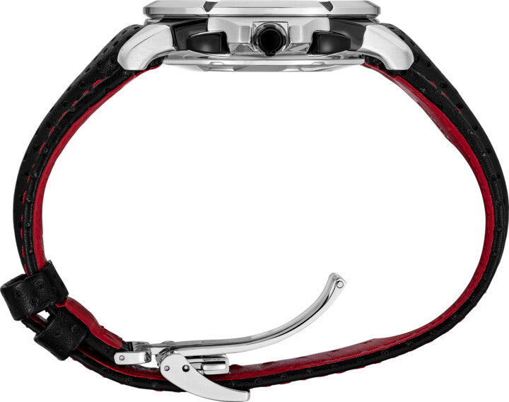 • Black and red perforated two-tone calf-skin leather strap with red contrasting stich