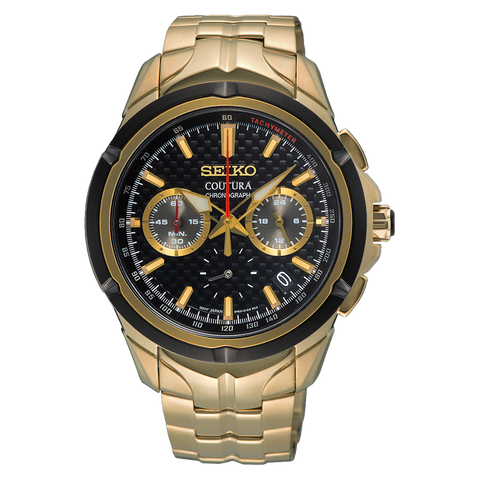 The Coutura Collection from SEIKO is a diverse timepiece with the looks of a dress watch and practical functionality of a sports piece. Inspired by motor sports racing, the new case and bracelet design incorporates angles and edges reminiscent of a racecar. The SSB440 quartz chronograph measures up to 60 minutes in 1/5-second increments with a split time measurement function and stopwatch. The polished gold-tone PVD coated stainless steel 42mm case has a black carbon fiber patterned dial with grooved black bezel. A screw down PVD stainless steel cabochon crown with jewel insert is protected by a crown guard between polished chrono pushers. Luminous skeleton diamond shaped hands and markers with red chrono hand are viewable behind a sapphire crystal. The chronograph features small seconds located centrally @6 with 24-hr sub-dial @3 and sub seconds @9. Powered by Seiko's own quartz caliber movement 8T63 with date function and 100 meter water resistance. The tapered polished and brushed chevron style gold-tone PVD coated stainless steel bracelet has a twin push button tri-fold safety clasp to keep your watch secure and in place.