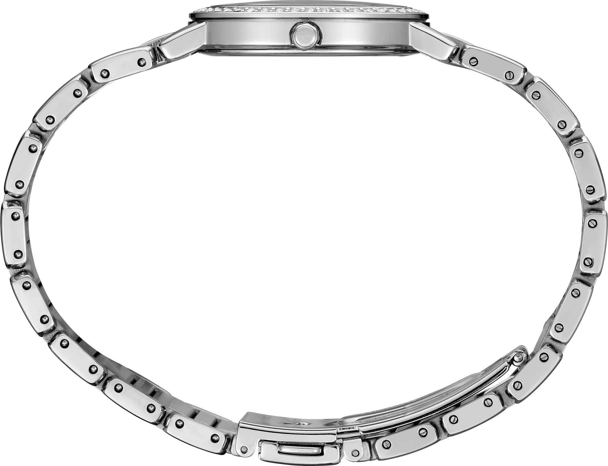 This ladies' Seiko solar wrist watch from the Essentials Collection, SUP467 is a breathtaking timepiece that features a mother-of-pearl dial surrounded by a crystal encrusted bezel. The 30.5mm circular polished stainless steel case has a radial pattern dial with a mix of Arabic and stick markers for dimension. Powered by light and Seiko's in-house, quartz solar movement Caliber V115 has a 12 month power reserve once fully charged. Equipped with a 30m water resistance rating and polished push/pull crown. Fitted with a polished and brushed single link bracelet with tri-fold butterfly clasp to secure on the wrist.