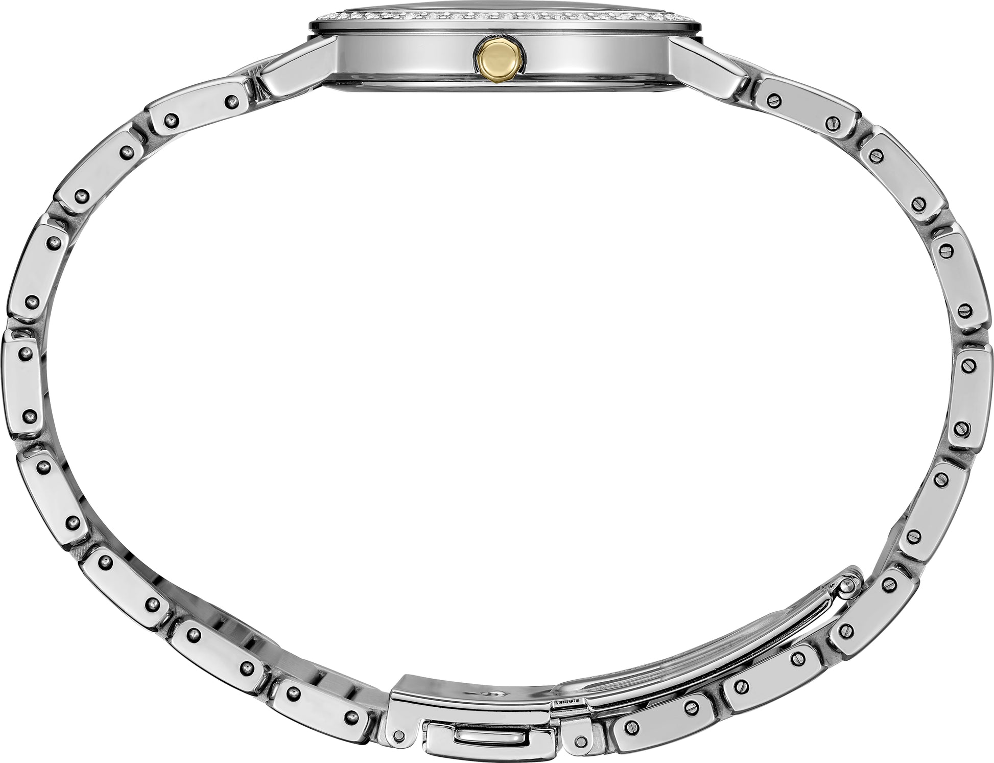 This ladies' Seiko solar wrist watch from the Essentials Collection, SUP469 is a breathtaking timepiece that features a mother-of-pearl dial surrounded by a crystal encrusted bezel. The 30.5mm circular polished two-tone stainless steel case has a radial pattern dial with a mix of gold-tone Arabic and stick markers for dimension. Powered by light and Seiko's in-house, quartz solar movement Caliber V115 has a 12 month power reserve once fully charged. Equipped with a 30m water resistance rating and polished gold-tone PVD coated stainless steel push/pull crown. Fitted with a polished and brushed single link two-tone bracelet with tri-fold butterfly clasp to secure on the wrist.